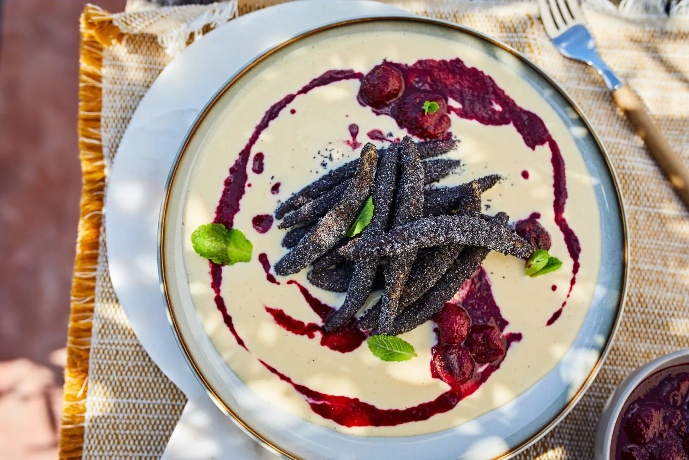 A mákos nudlit az angolkrémmel és a meggyszósszal tálaljuk, végül néhány mentalevéllel díszítjük.