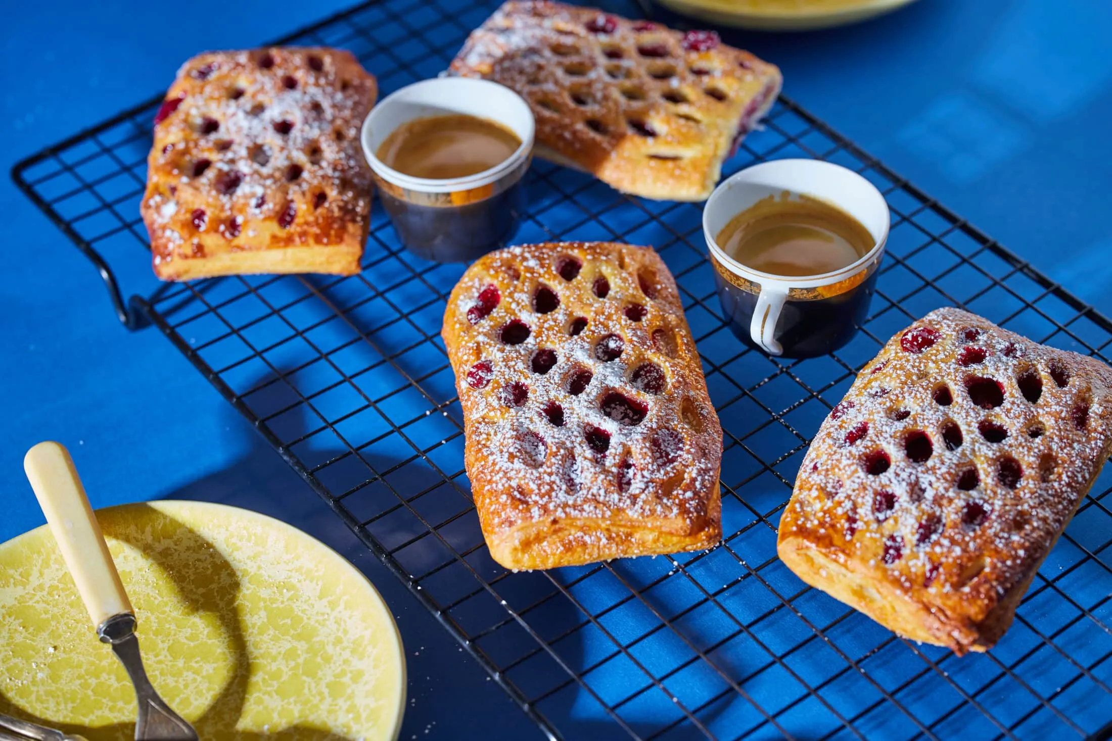 A 4 egyforma lapnál halványan bejelöljük kb. 10 cm-nél a tésztát, és erre a nagyobb részre halmozzuk a tölteléket úgy, hogy kb. 1 cm-es sávot kihagyunk a széleknél, amiket lekenünk vékonyan tojással. A maradék 6 cm-es részt rácsosan bevagdossuk, majd ráhajtjuk a töltelék tetejére. A rácsok miatt kissé nyúlik a tészta, így szép mintát fog alkotni a süti tetején. A széleket óvatosan lenyomkodjuk, és sütőpapíros tepsire rakjuk őket. A maradék 2 db tésztát összetapasztjuk, hasonlóképpen megtöltjük, összehajtjuk, majd az így kapott öt párna tetejét lekenjük tojással, és 175 fokra előmelegített sütőben kb. 30 perc alatt készre sütjük a sütiket. Ha hűlt egy kicsit, megszórhatjuk a tetejét porcukorral, és már ehetjük is!