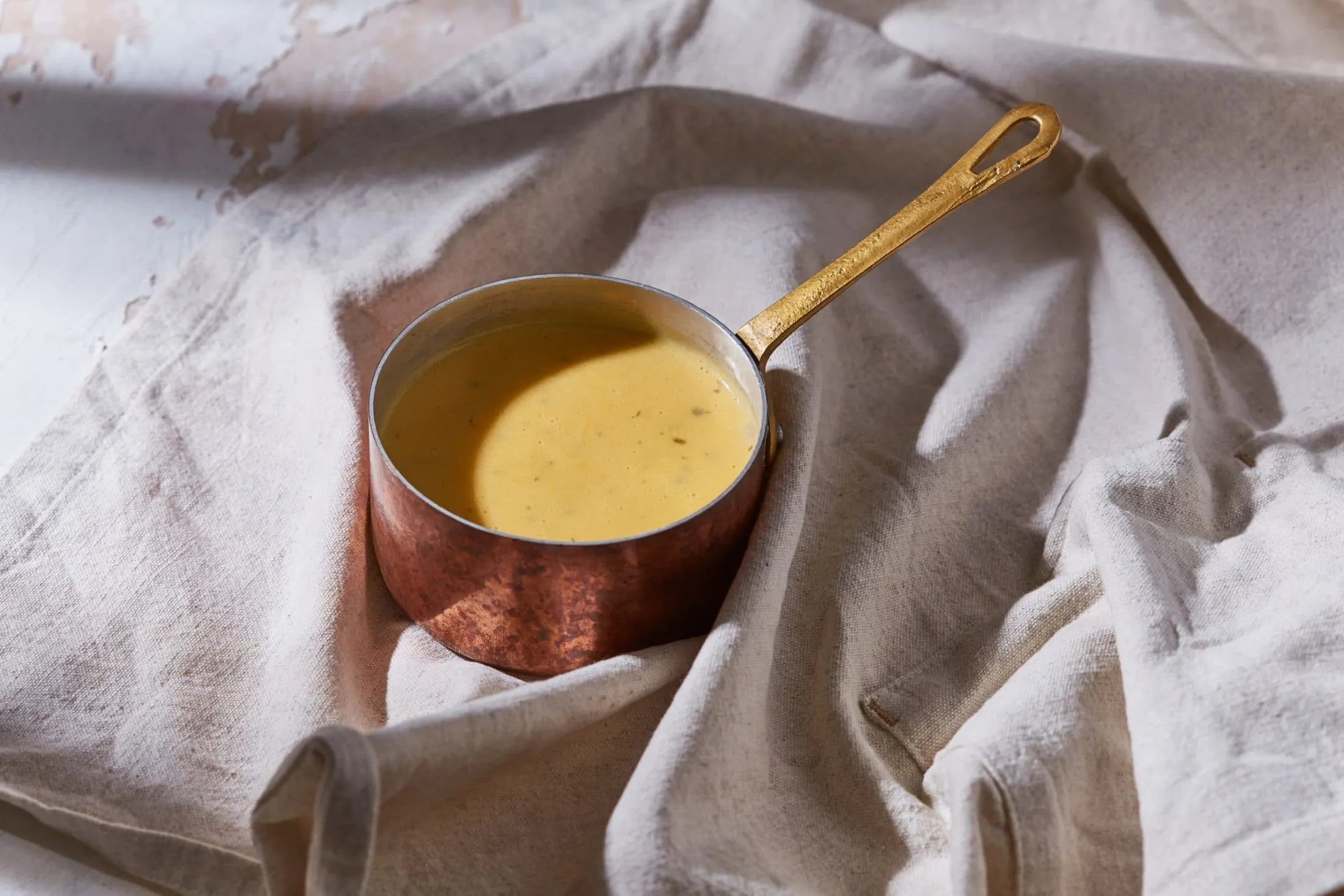 A tárkonyt elkeverjük az ecetben, 5 percet állni hagyjuk, majd a többi összetevővel egy kis lábasban vagy gyorsforralóban összekeverjük, és közepes lángon, habverővel folyamatosan kevergetve sűrűre melegítjük. Először felhabzik majd, de miután elült a hab, 2-3 perc alatt besűrűsödik, és ott már vigyázni kell, nehogy túlmelegítsük, és rántotta legyen belőle.