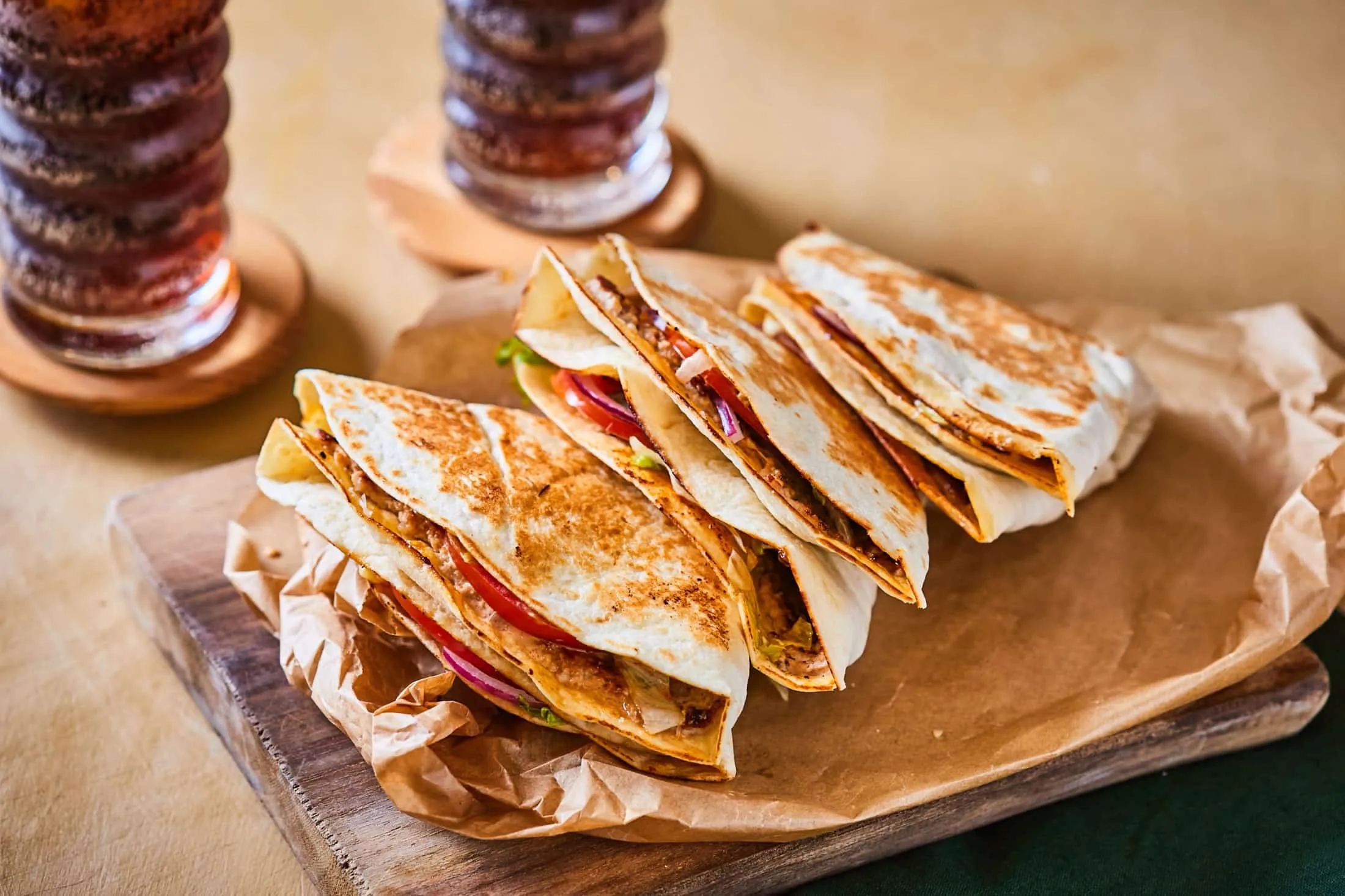 Mindegyik tortillába teszünk pár karika paradicsomot és jalapenót, majd félbe és megint félbehajtjuk. Az így kapott háromszögeket száraz serpenyőben oldalanként 1-2 perc alatt megpirítjuk, és kész is vagyunk.