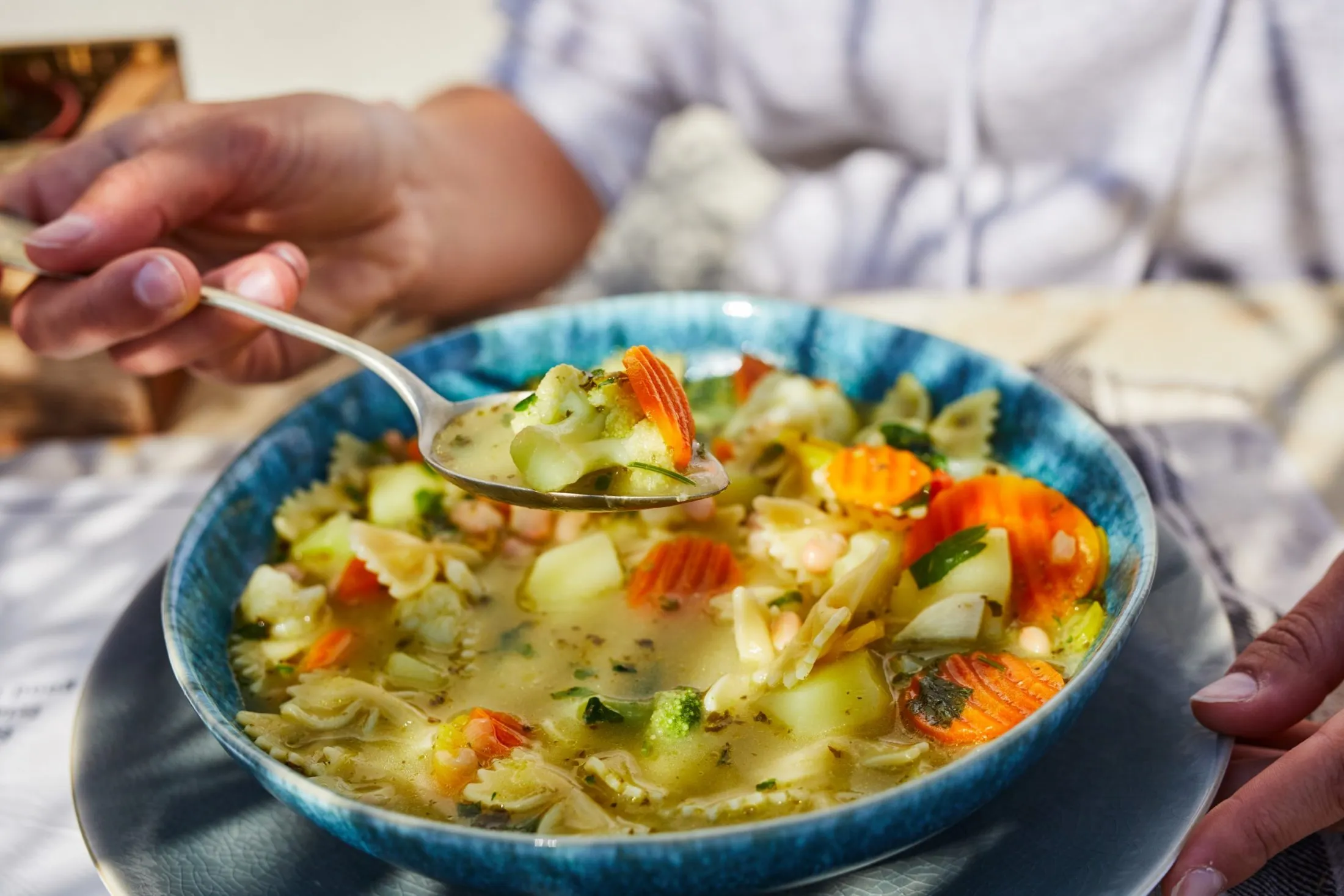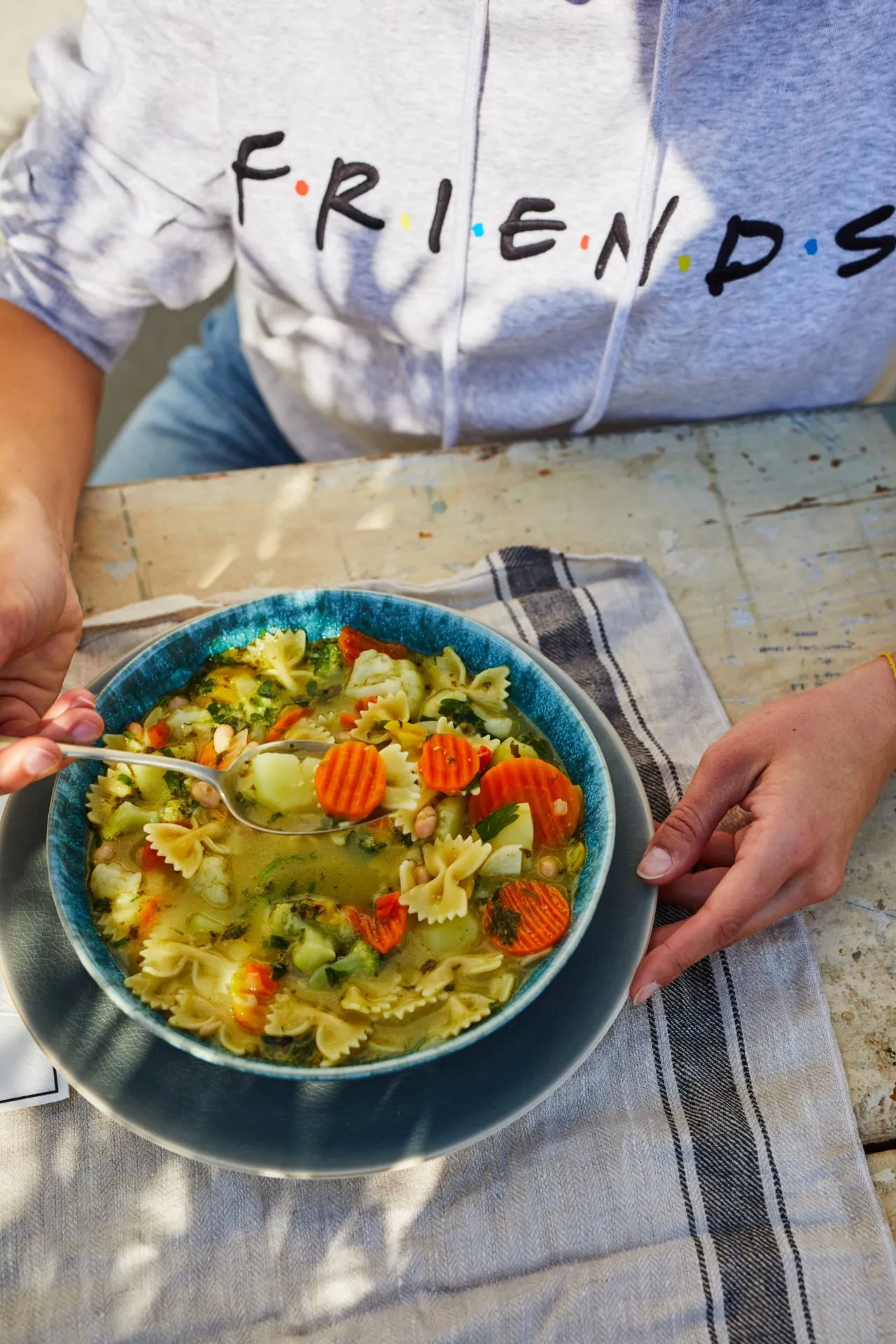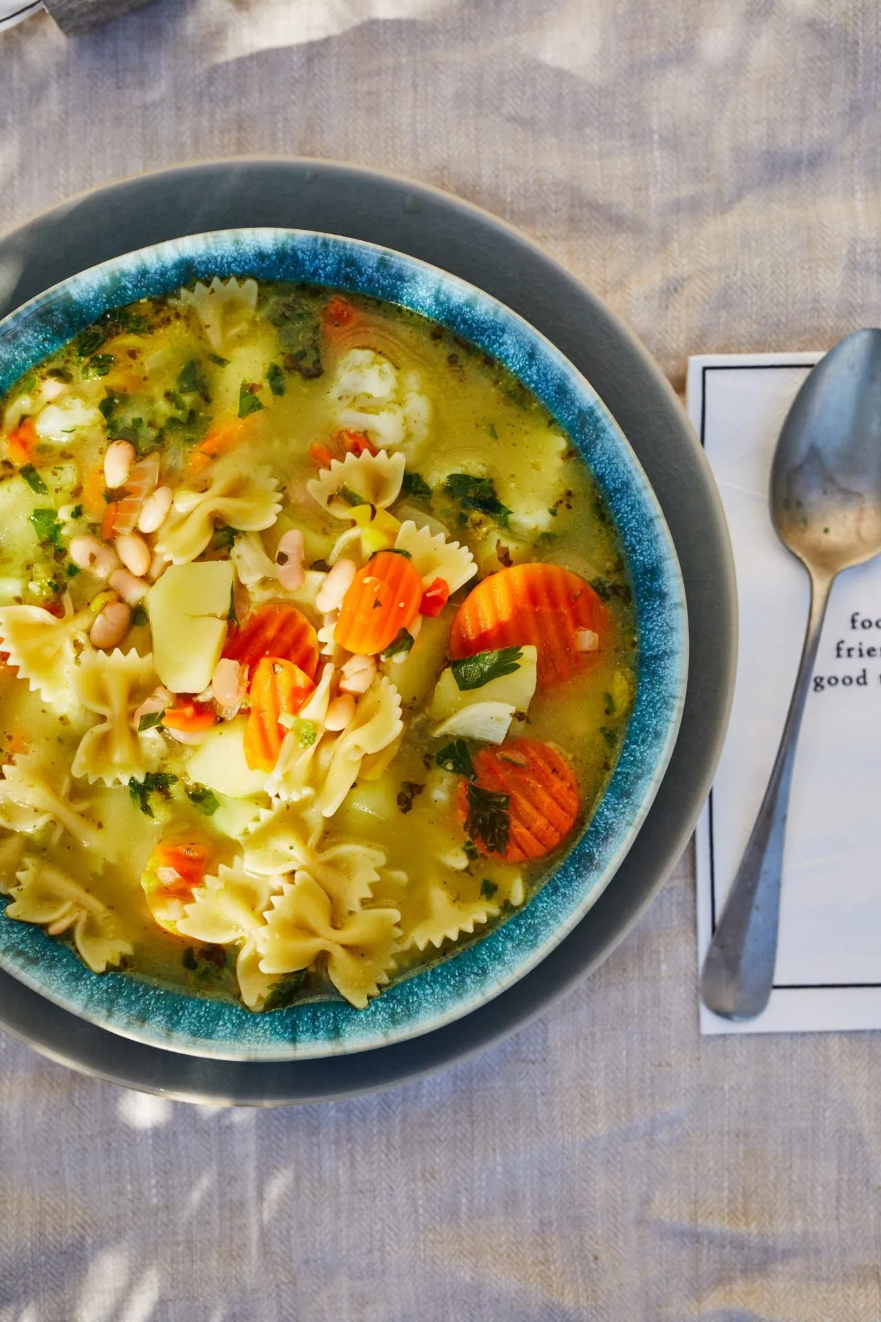 Az olajon üvegesre pároljuk az apróra vágott hagymát és fokhagymát, sózzuk, borsozzuk, majd rádobjuk a kis kockákra vágott krumplit. Elkeverjük, felöntjük az alaplével, felforraljuk, és addig főzzük, amíg meg nem puhul félig a krumpli. Én olyan zöldségmixet használtam, aminek 8 perc kell a papír szerint, így amikor félig megpuhult a krumpli, beleraktam a tésztával és a babbal együtt, és még 10 percig főztem.
