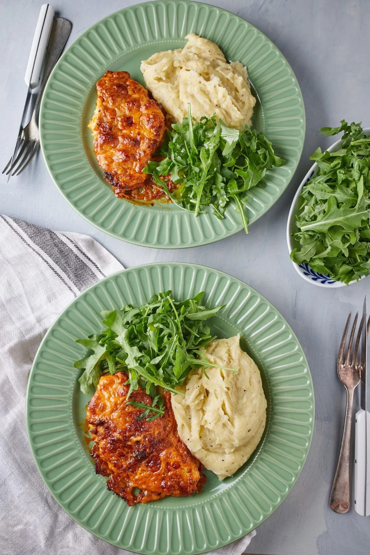 A krumplipüréhez a krumplit megpucoljuk, kis kockákra vágjuk, sós vízben puhára főzzük, melegen áttörjük, fűszerezzük és belekeverjük a hideg vajat. A megsült húst a krumplipürével és a rukkolával tálaljuk.