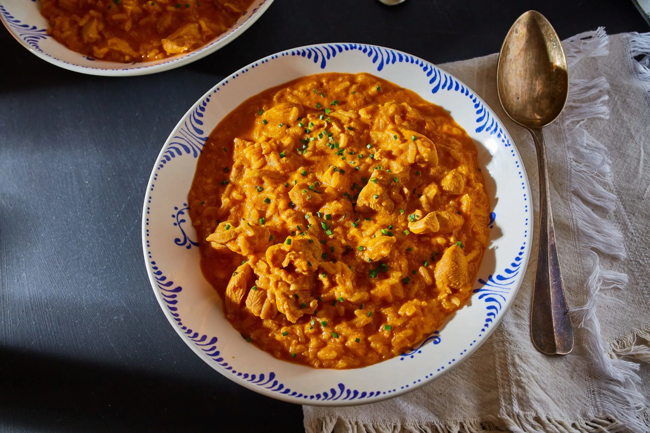 A tejfölt egy tálban kikeverjük 1-2 merőkanál szafttal, visszaöntjük a húsra, és ha rottyant egyet, mehet bele a rizs. Ha újra felforrt, elzárjuk, és snidlinggel megszórva tálaljuk.
