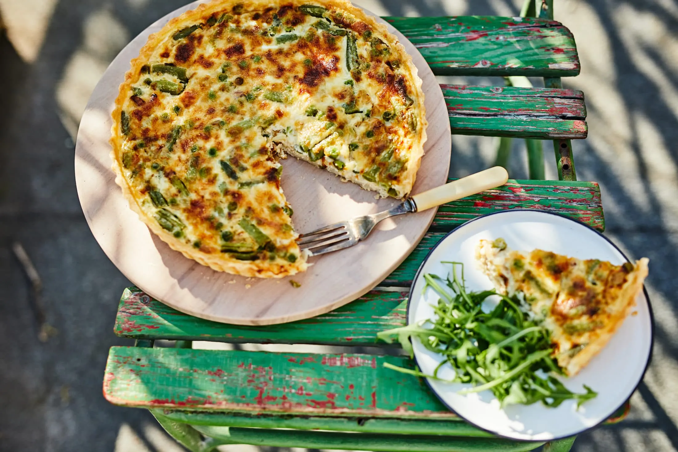 A tojást, a reszelt sajtot és a tejet összekeverjük. A piteformába nyomkodjuk a leveles tésztát, egy villával megszurkáljuk a tetejét, és 180 fokra előmelegített sütőben 3 percig sütjük, majd kivesszük. Ekkor mehet rá a zöldség, majd a tojásos keverék. Visszatesszük 25 percre, majd feljebb kapcsoljuk a sütőt 200 fokra, és további 10 percig sütjük. Friss rukkolával tálaljuk.