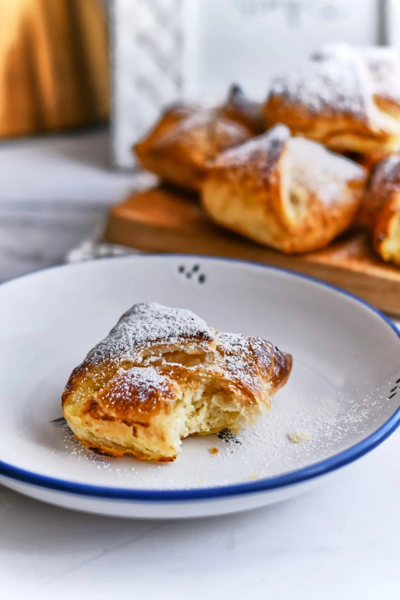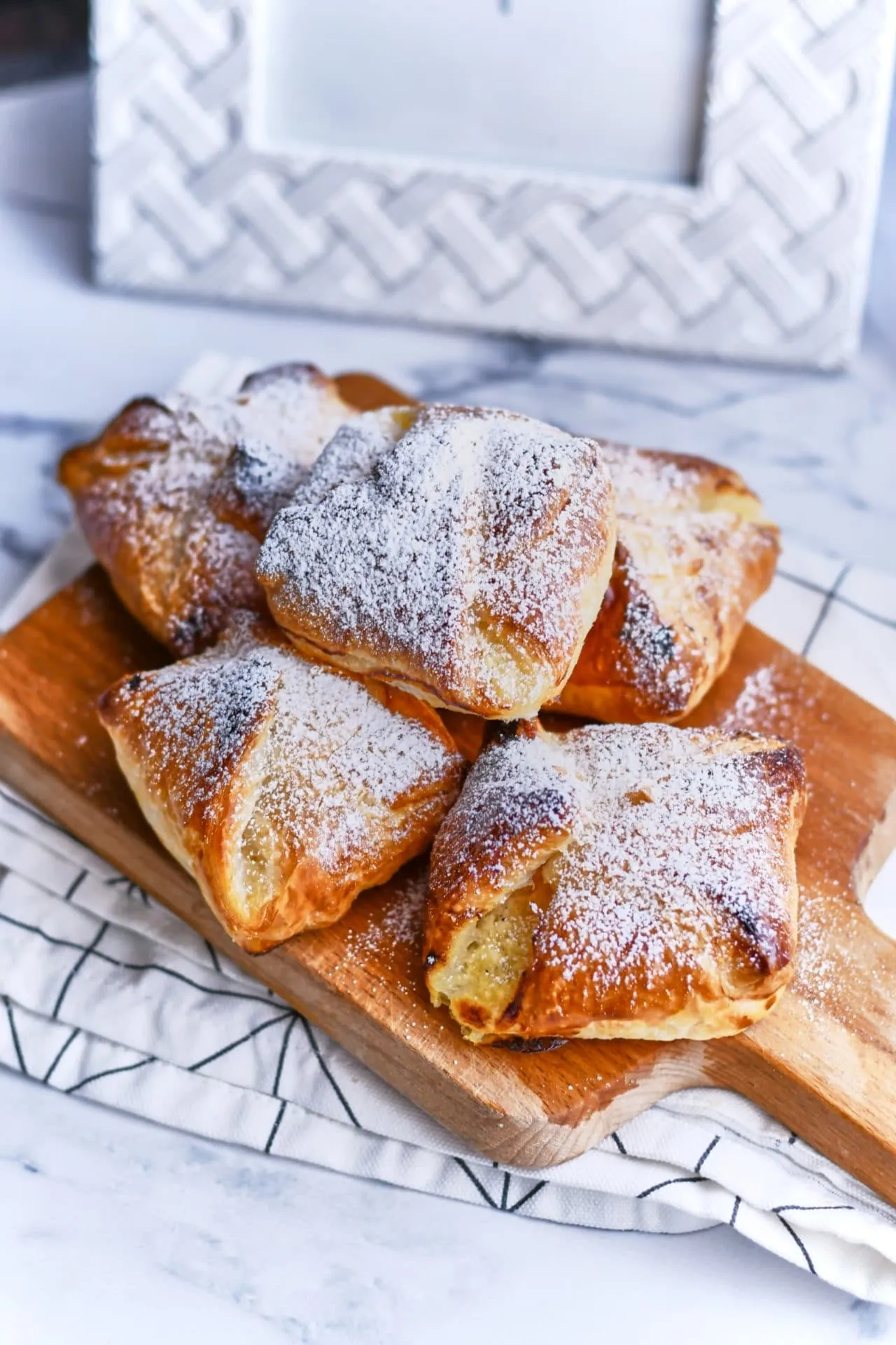 A leveles tésztát felhasználás előtt 10-15 perccel kivesszük a hűtőből, majd kihajtogatjuk, és 8 egyenlő részre osztjuk. A túrót kikeverjük a többi hozzávalóval, majd a kis tésztanégyszögek közepére halmozzuk.