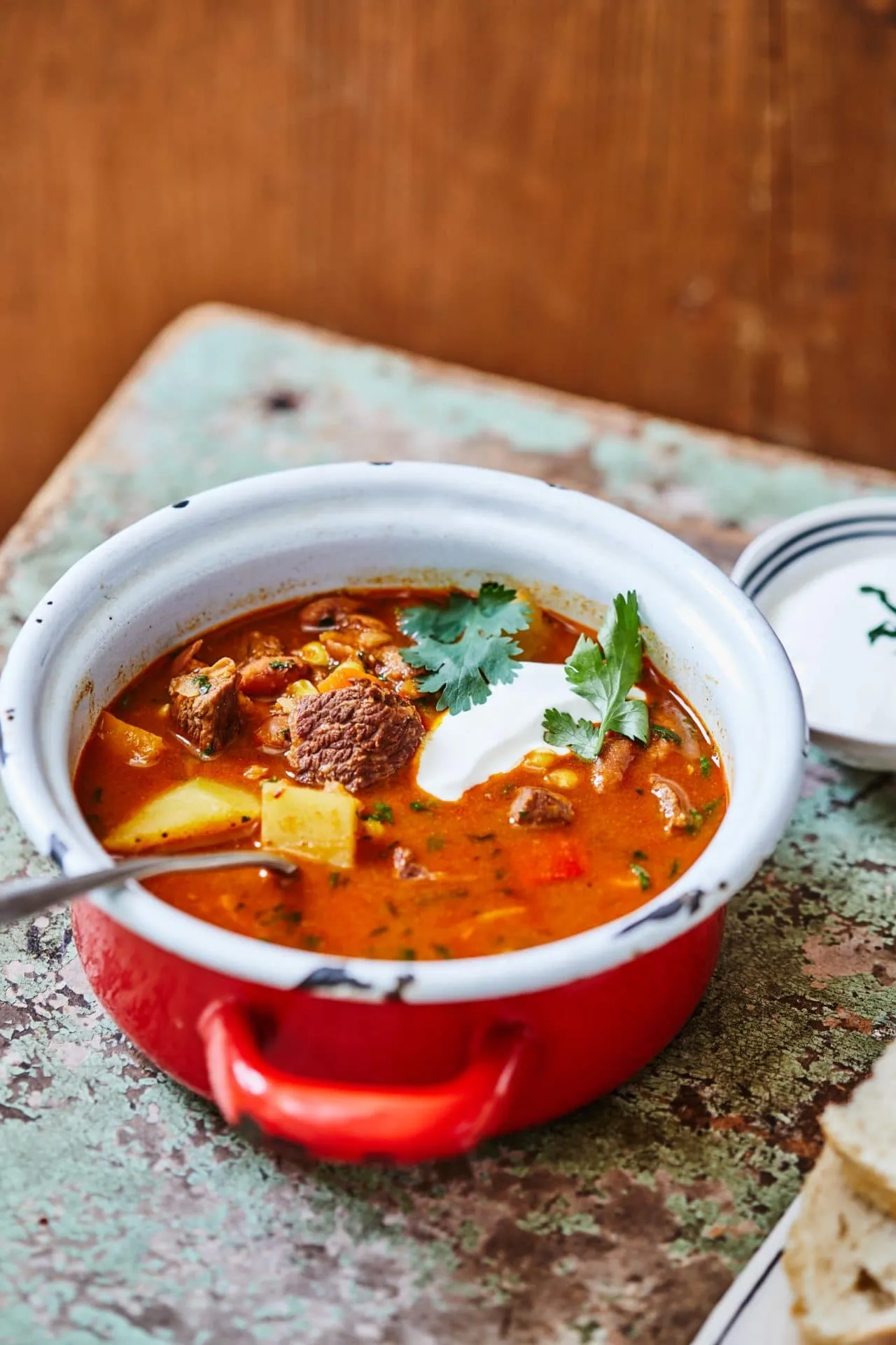Beletesszük a kockára vágott marhahúst, felöntjük a marhaalaplével, sózzuk, borsozzuk, és közepes lángon addig bugyogtatjuk, amíg a hús szinte teljesen puha nem lesz. Ekkor beletesszük a kukoricát, a kockára vágott pritamin paprikát, burgonyát és a félkarikára vágott répákat. Addig főzzük, amíg a zöldségek meg nem puhultak, végül hozzákeverjük a babot, és ízés szerint sózzuk, borsozzuk. Elzárjuk a lángot, majd belekeverjük az apróra vágott friss koriandert. Ha szeretnénk, akkor tejföllel fogyaszthatjuk.