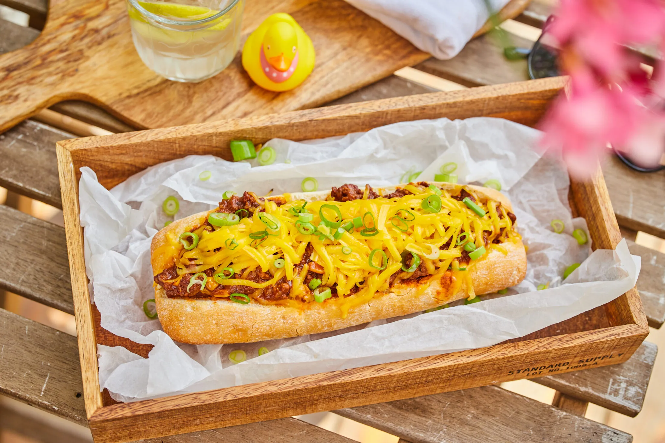 A bagettek tetejét ék alakban kivágjuk, megszórjuk a reszelt sajt egy részével, majd a grillrácsra helyezzük. Lecsukjuk a grillt, kb. 1 percig hagyjuk, hogy a sajt kissé beleolvadjon a bagettbe és az is átmelegedjen. Kivesszük a grillből a hot dogokat, belekanalazzuk a ragut és a tetejüket megszórjuk a maradék sajttal és az újhagyma karikára vágott zöldjével.