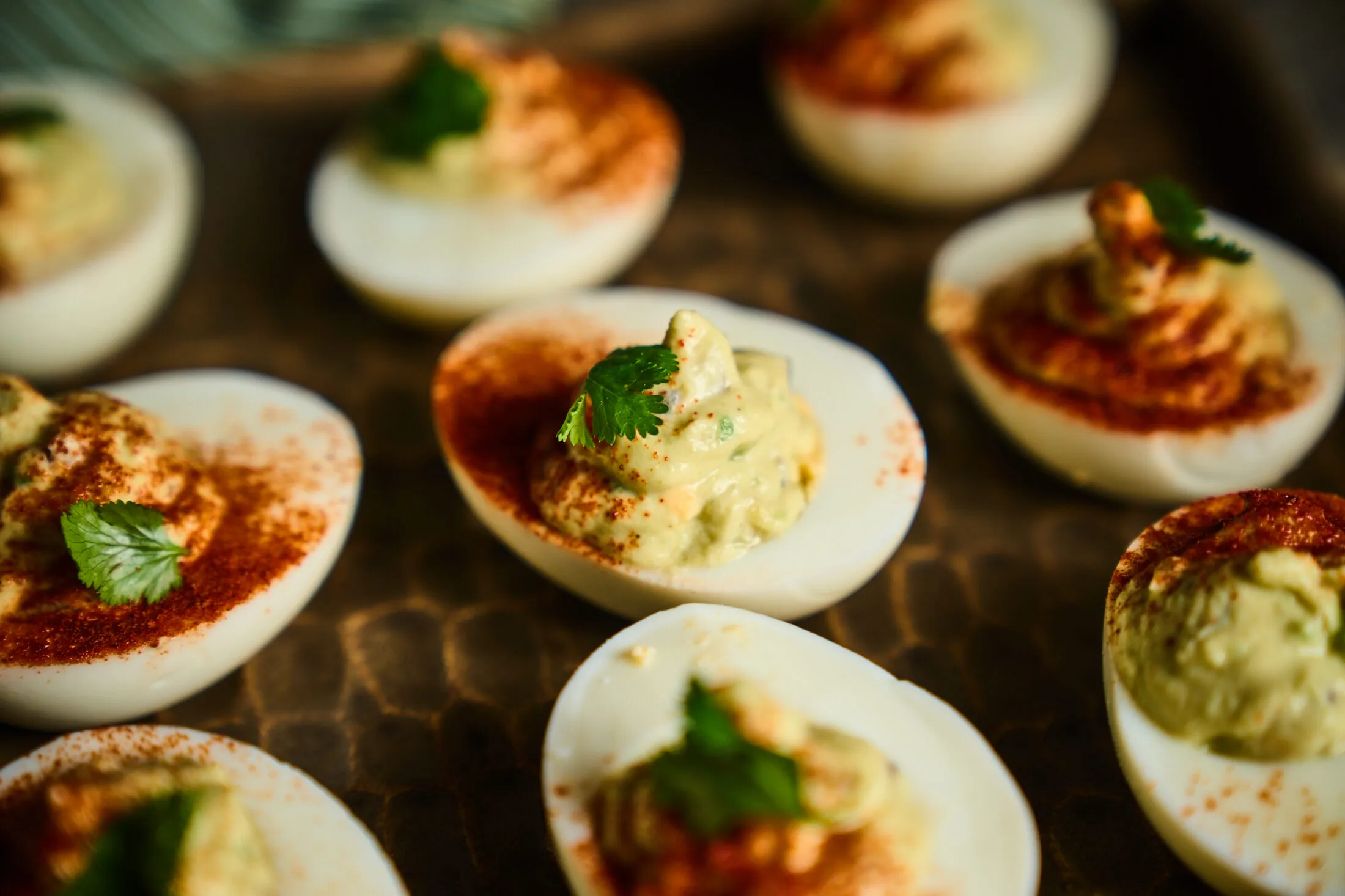 Megpucoljuk a tojásokat, leöntjük a meleg savanyítólével, és egy éjszakát állni hagyjuk benne. Másnap az avokádót egy tálba tesszük, meglocsoljuk fél lime levével, sózzuk, és villával pépesre törjük. Hozzákeverjük a tejfölt, borsozzuk, hozzáadjuk a mézet és a félbevágott tojások sárgáját. Belekeverjük a krémbe a finomra vágott lila hagymát, aztán visszatöltjük a fehérjékbe. A kaszinótojásokat füstölt paprikával és korianderlevelekkel díszítjük.