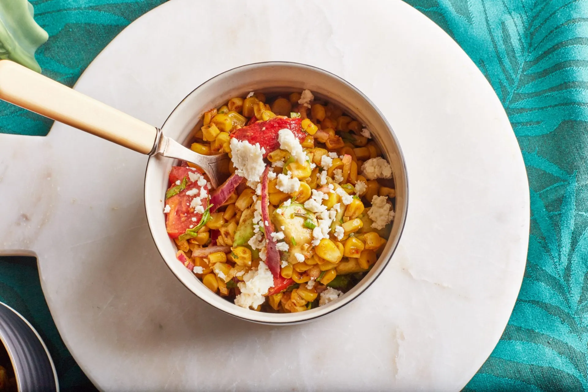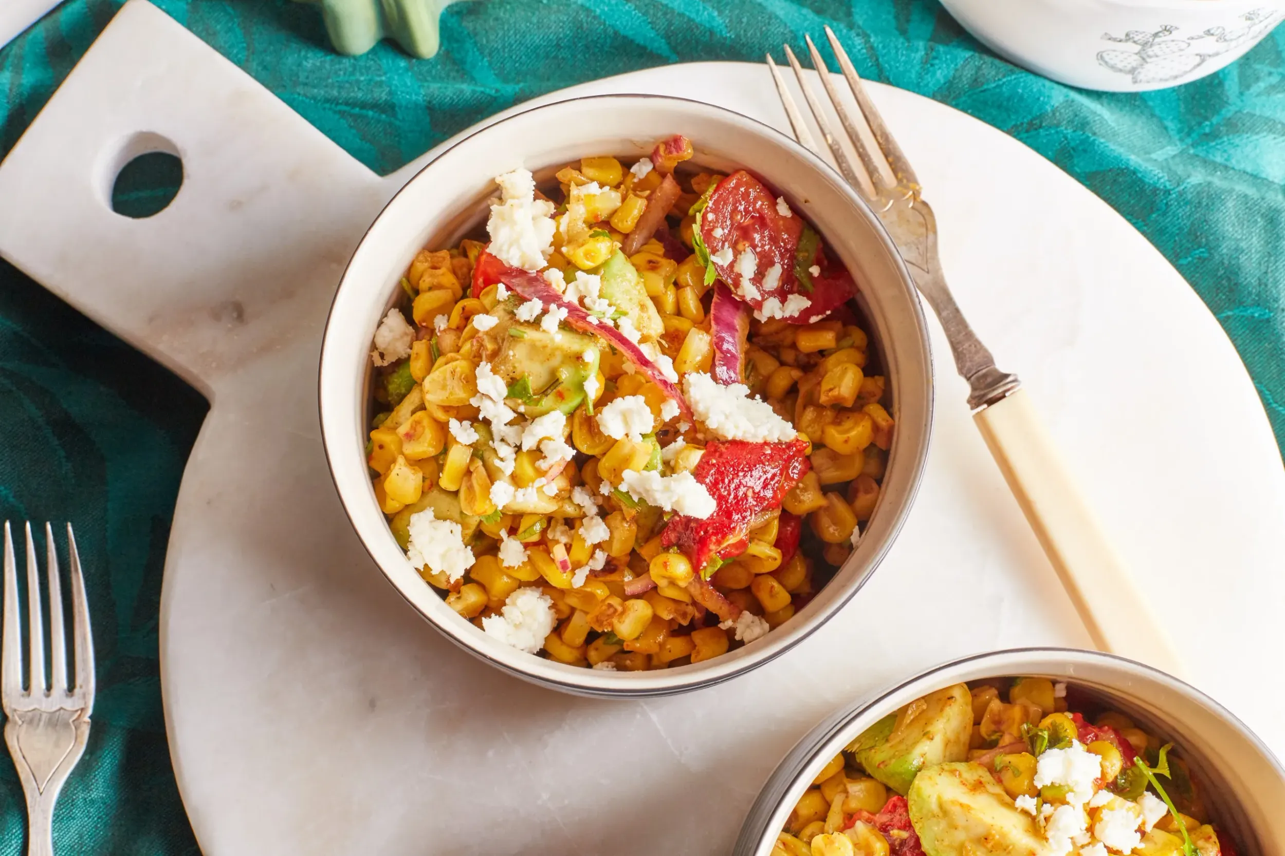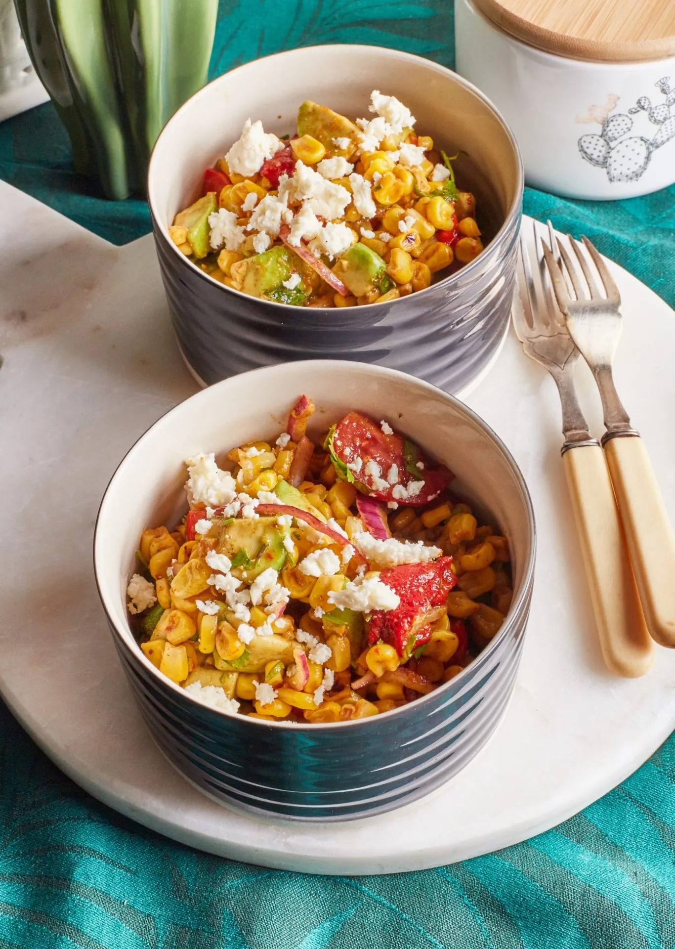 Egy nagy keverőtálba rakjuk a pirított kukoricát, a sült paprikát, az avokádót, a paradicsomot, lilahagymát, felaprított jalapeno paprikát, koriandert és összeforgatjuk a maradék olívaolajjal és a lime másik felének a levével. Tálakba szedjük és rámorzsolunk egy kis fetát.