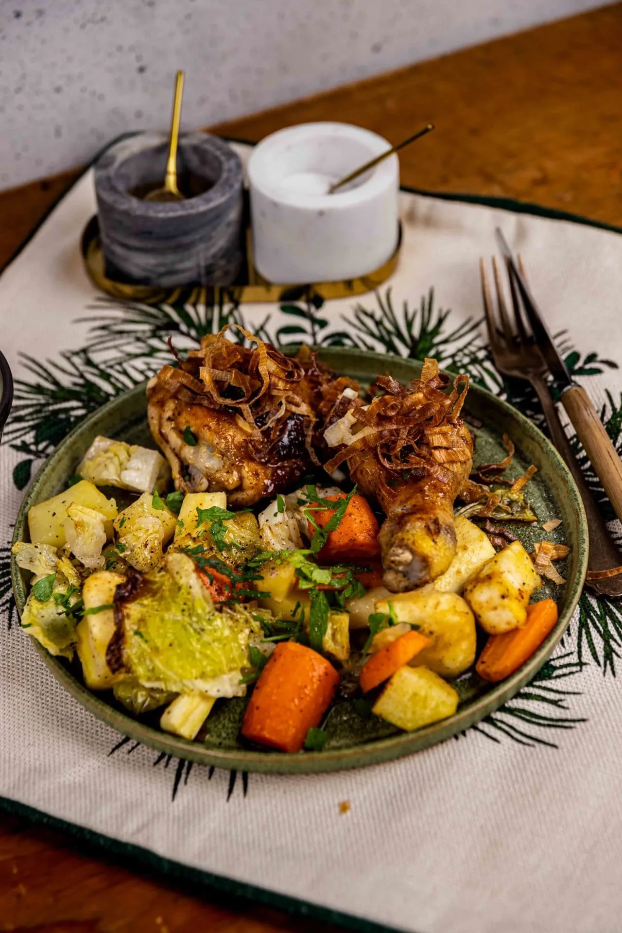 Tálaláshoz a tányérba szedünk a zöldségből, rátesszük a combokat, kicsit meglocsoljuk a maradék whiskey-s mázzal, megkoronázzuk a ropogós hagymával, és mellé kínáljuk a kéksajtmártást.