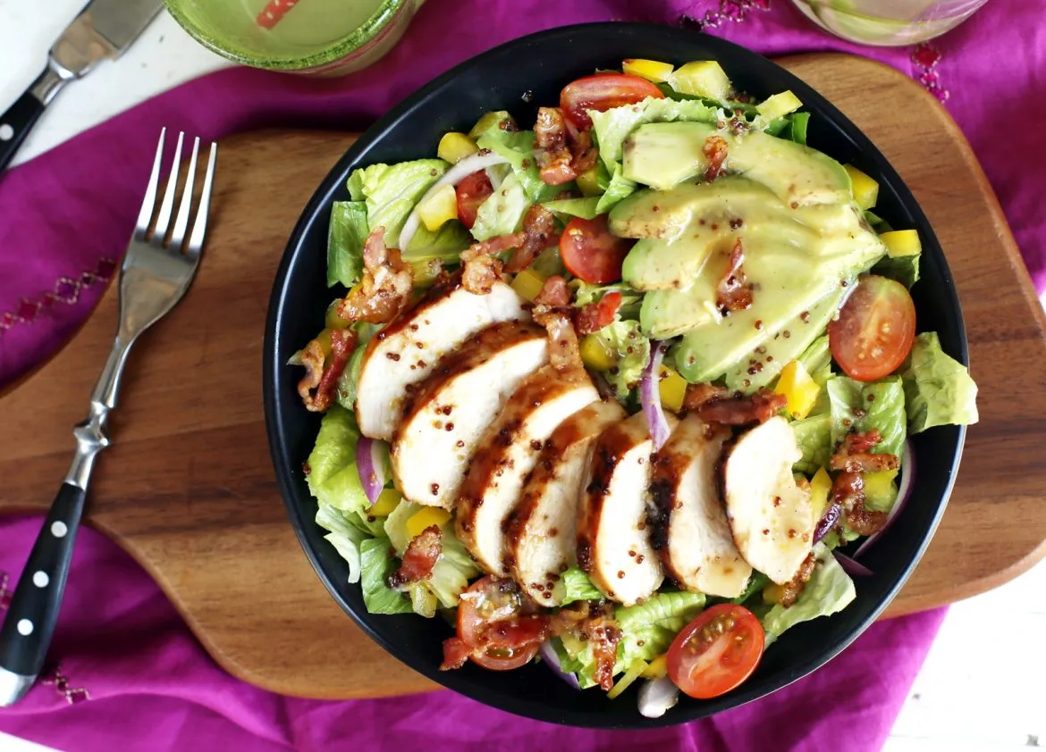 Az olívaolajat összekeverjük a mustárokkal, a mézzel, a sóval, a borssal és zúzott fokhagymával és kb. 2 kanálnyi kivételével az egészet a csirkemellekre öntjük, jól beledörzsöljük. Egy forró serpenyőben  megsütjük a csirkék mindkét oldalát, majd félrerakjuk. A bacont felaprítjuk és lepirítjuk a serpenyőben. A római salátát két tálba tépkedjük. A paradicsomokat félbevágjuk, a paprikát és lilahagymát kockákra vágjuk és a salira szórjuk. Erre fektetjük a felszeletelt csirkemellet és avokádót, megszórjuk a pirított baconnel és a maradék öntettel meglocsoljuk.