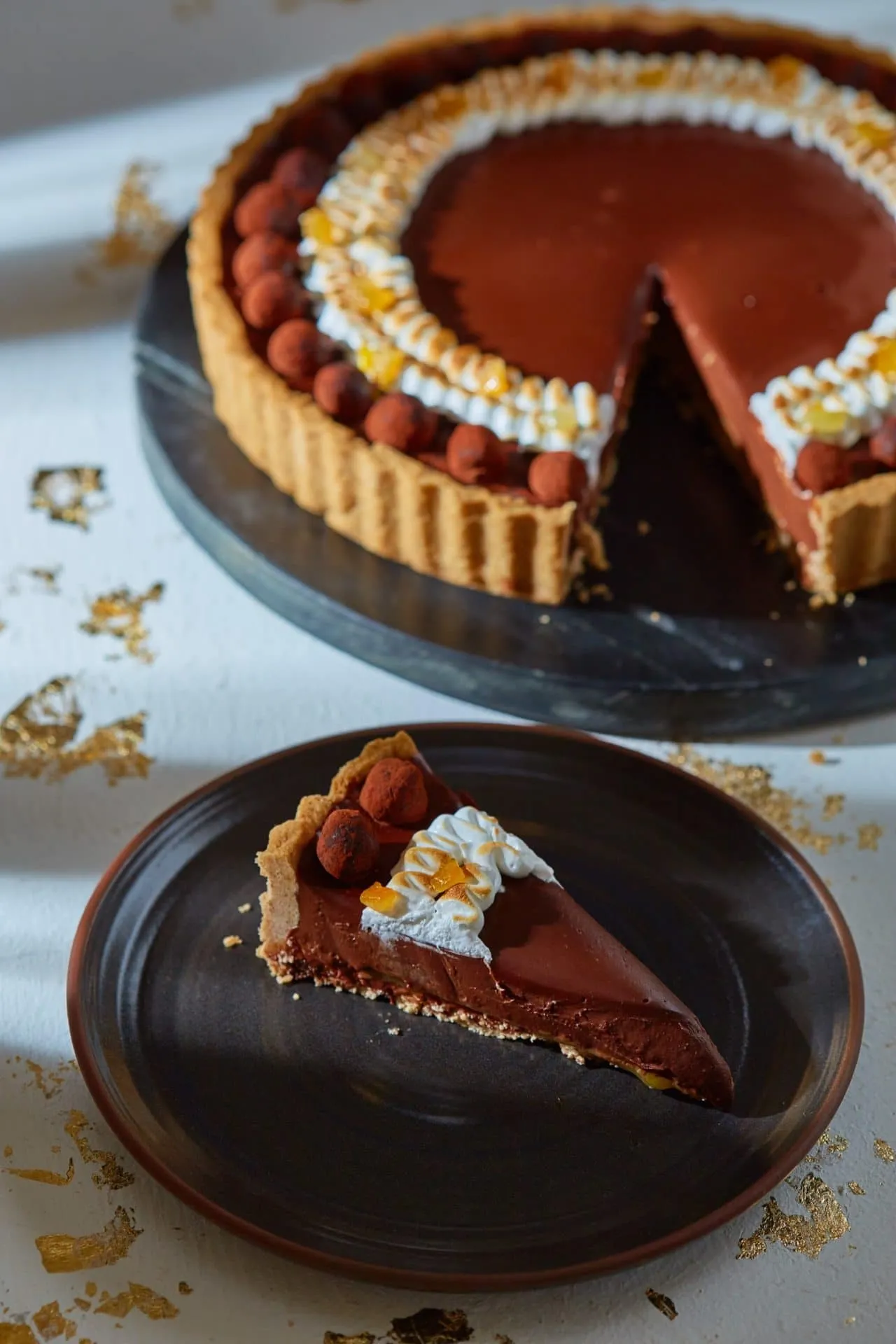 Amikor megdermedt, a díszítéshez a tojásfehérjét elkezdjük kihabosítani, majd fokozatosan belekeverjük a cukrot, és stabilabb habcsók állagú „krémet” keverünk belőle. Nyomózsákba rakjuk, és a megformázott fehérjehabot kicsit megkaramellizáljuk egy szakácsfáklyával, valamint a csokigolyókkal díszítjük a tortát.