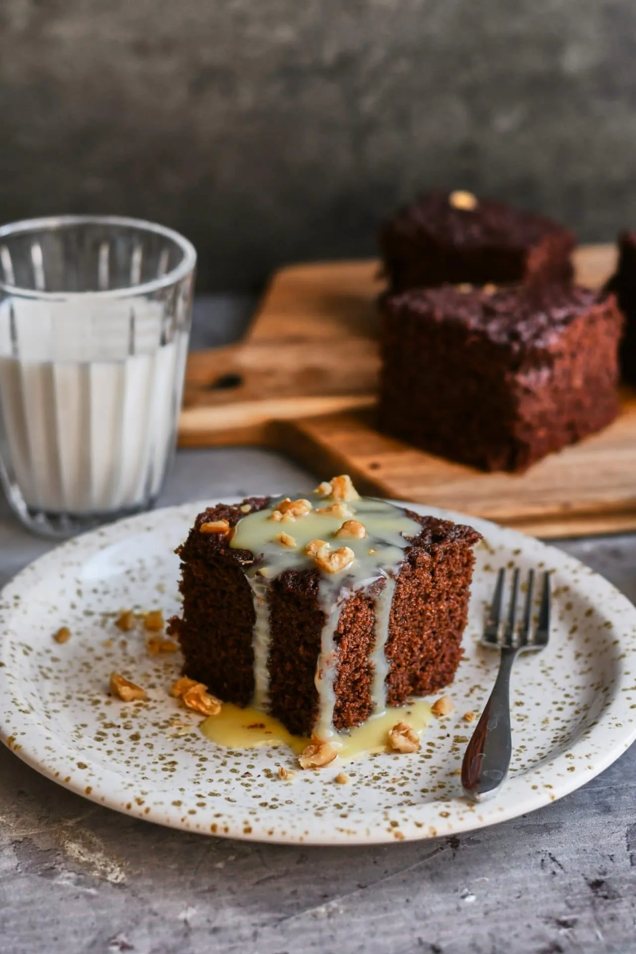 Közben a tejszínt jól felmelegítjük, beletördeljük a fehér csokit, és ha elolvadt, ezzel az öntettel öntjük le a kockákra vágott sütit.