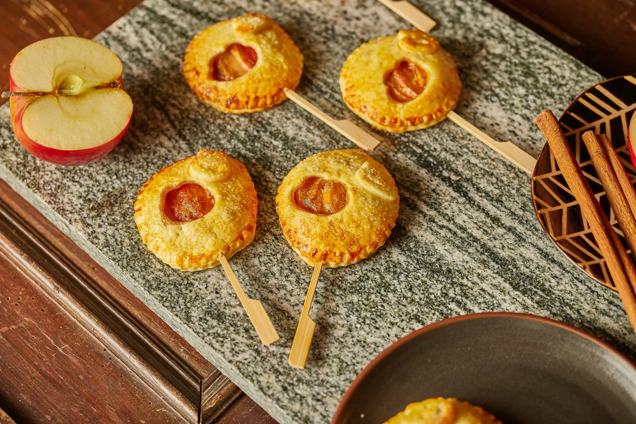 A linzertésztát kitérítjük, majd 12 egyenlő kört szúrunk ki belőle. 6 db tésztalapra eloszlatjuk az almaszeleteket. A maradék 6 lapot egy kisebb kiszúróval mintázzuk, ami segít abban is, hogy a felesleges gőz távozzon, majd befedjük vele az almás korongokat, és a széleit egy villával lenyomkodjuk. Lekenjük a felvert tojással és megszórjuk egy kevés cukorral is. Ha szeretnénk, a kisebb kiszúróval szaggatott tésztadarabot is feltehetjük díszítésként a tészta tetejére.