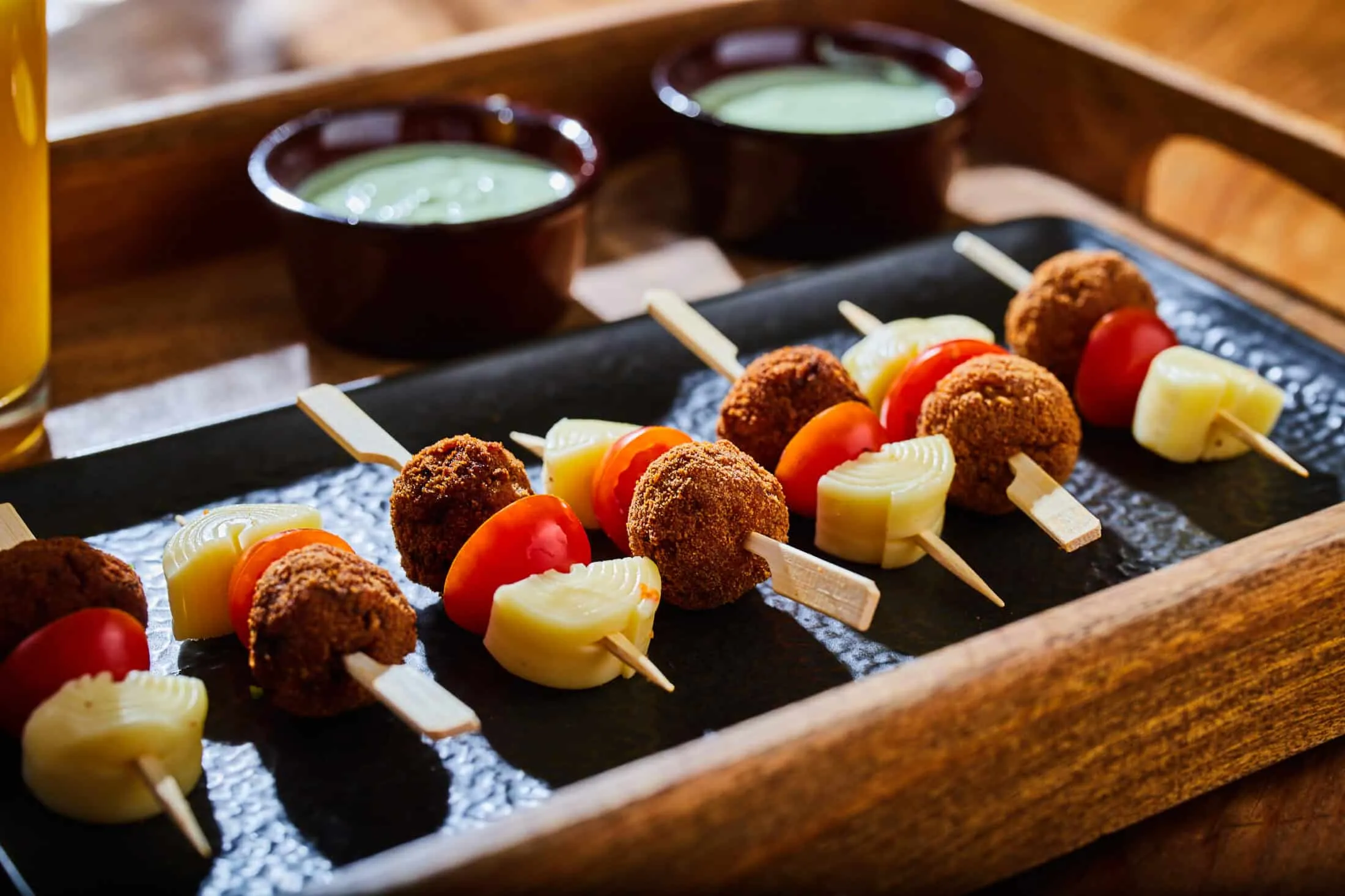 A paradicsomokat és a sajtot elfelezzük, és jöhet is az összeállítás. Felváltva nyársra húzzuk a fasírtot, a paradicsomot és a sajtot. A kész nyársakat a mártogatóssal tálaljuk.