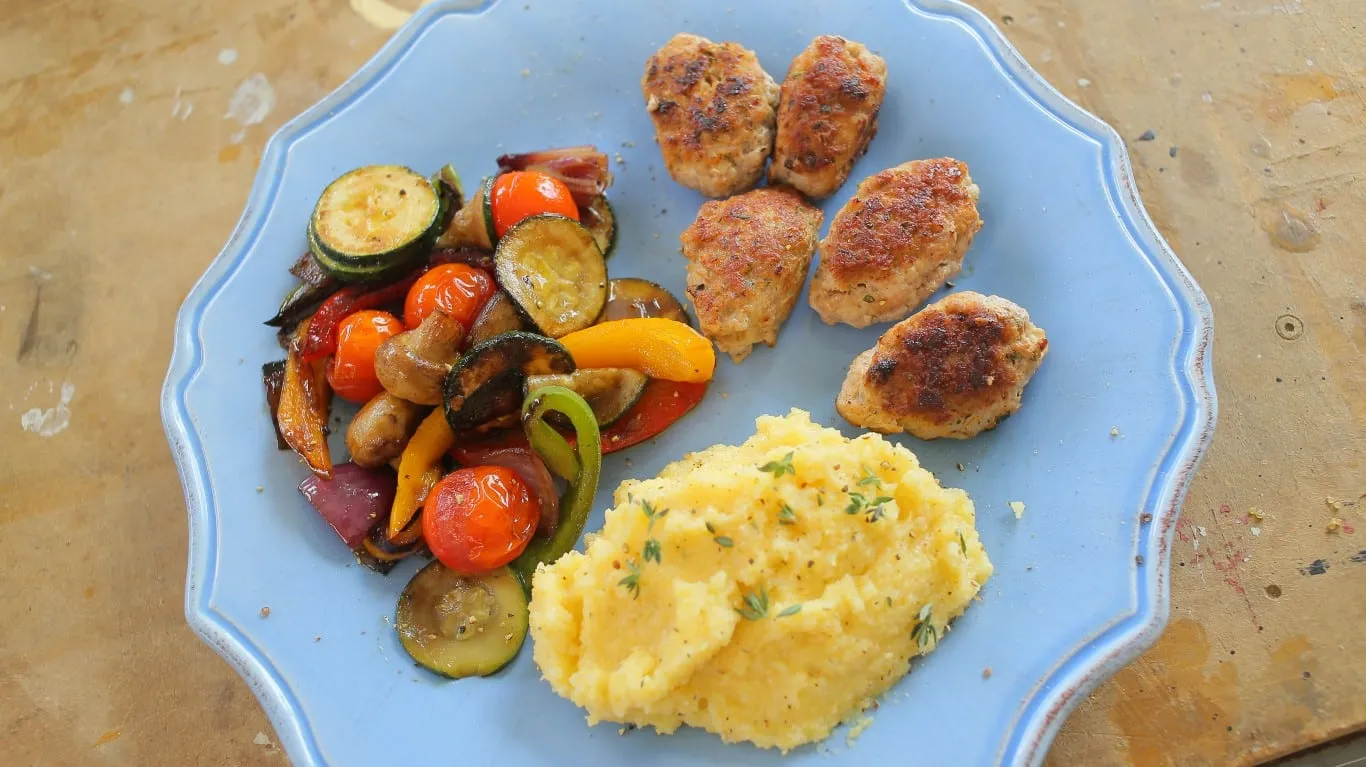 A kukoricadarát, a vajat és a fetát (belemorzsolva) forró vízbe tesszük, majd összekeverjük, sózzuk, borsozzuk, beletesszük az oregánót is és készre főzzük. A húshoz adjuk a felaprított fokhagymát, rozmaringot, kakukkfüvet, pirospaprikát, sózzuk, borsozzuk és alaposan összegyúrjuk. A húsból kis kolbászokat formázunk és forró, olívaolajos serpenyőben, közepes lángon minden oldalukat aranybarnára sütjük. Egy forró olívaolajos serpenyőben, pár perc alatt megpirítjuk a gombákat, majd hozzáadjuk a vastagabb csíkokra vágott paprikát, a felkarikázott cukkinit, a nagyobb darabokra vágott hagymát és az egész koktélparadicsomokat. Összerázzuk és tovább pirítjuk. Végül sózzuk és a kisült kolbászkákkal, valamint a polentával tálaljuk.