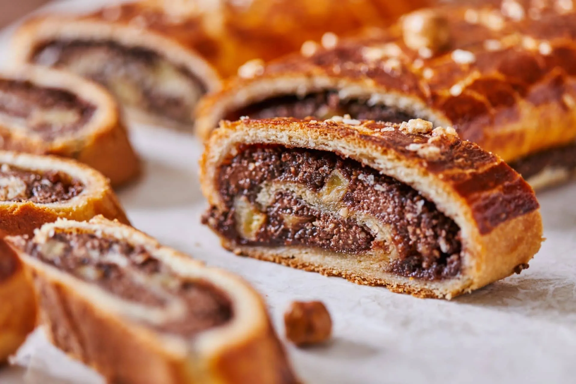 Kivesszük a tésztagombócokat a hűtőből, és lisztezett deszkán, mindkettőt 32 x 20 cm-esre nyújtjuk. Mindkét tésztánál a 32 cm-es oldal alsó részétől elkenjük a tölteléket úgy, hogy a két szélső oldalnál és a fenti hosszabbik oldalnál hagyjunk ki kb. 1,5 cm-t. A mogyorókrémes tölteléket megszórjuk a kisebb darabokra vágott banánnal. A két oldalánál behajtjuk a tésztát, majd feltekerjük, és sütőpapíros tepsire rakjuk őket. Megszurkáljuk villával a tetejüket, és lekenjük tojássárgájával, majd hideg helyre rakjuk addig, amíg megszárad a kenés. Ezután lekenjük tojásfehérjével, és ilyenkor rakhatunk a tetejére díszítésként egész mogyorószemeket vagy épp szórócukrot. Megvárjuk, amíg a fehérjés lekenés is megszárad, majd először 200 fokra előmelegített (alsó-felső sütés) sütőbe toljuk 15 percre, utána pedig 185 fokon sütjük további 10 percig. Ha kibírjátok, érdemes legalább pár órán át pihentetni, hogy teljesen ki tudjon hűlni! :)