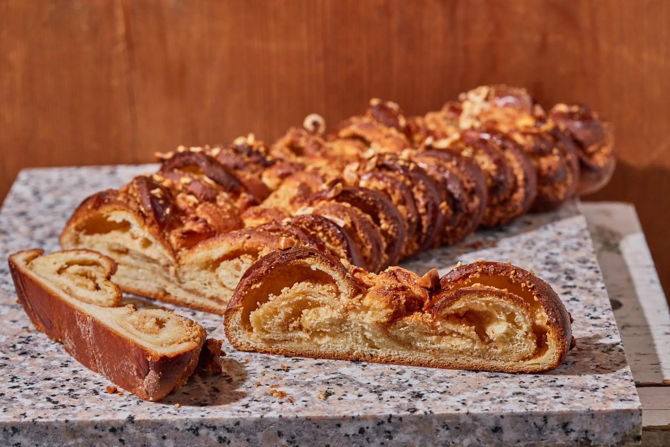 A tésztát lisztezett deszkán kb. 40 x 35 cm-es téglalappá nyújtjuk, megkenjük a töltelékkel, majd a hosszabbik oldalánál feltekerjük, és átrakjuk egy sütőpapíros tepsire. Egy éles késsel 2,5-3 cm-enként bevágjuk a tésztát úgy, hogy nem vágjuk teljesen át, és mindegyik tekercset kihajtjuk, egyszer jobbra, a következőt pedig balra.
