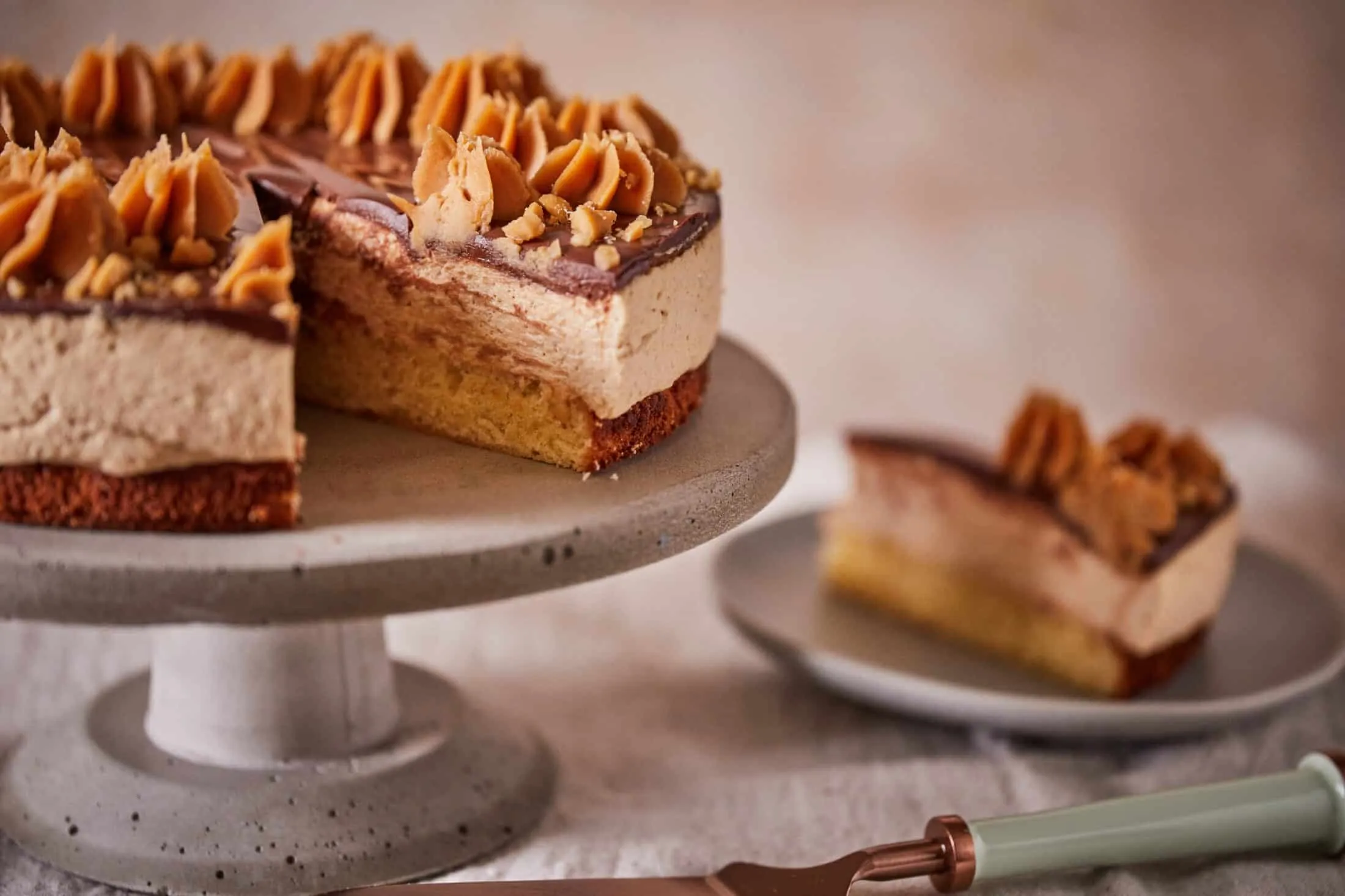 A mogyoróvajas joghurtmousse-torta tálalása