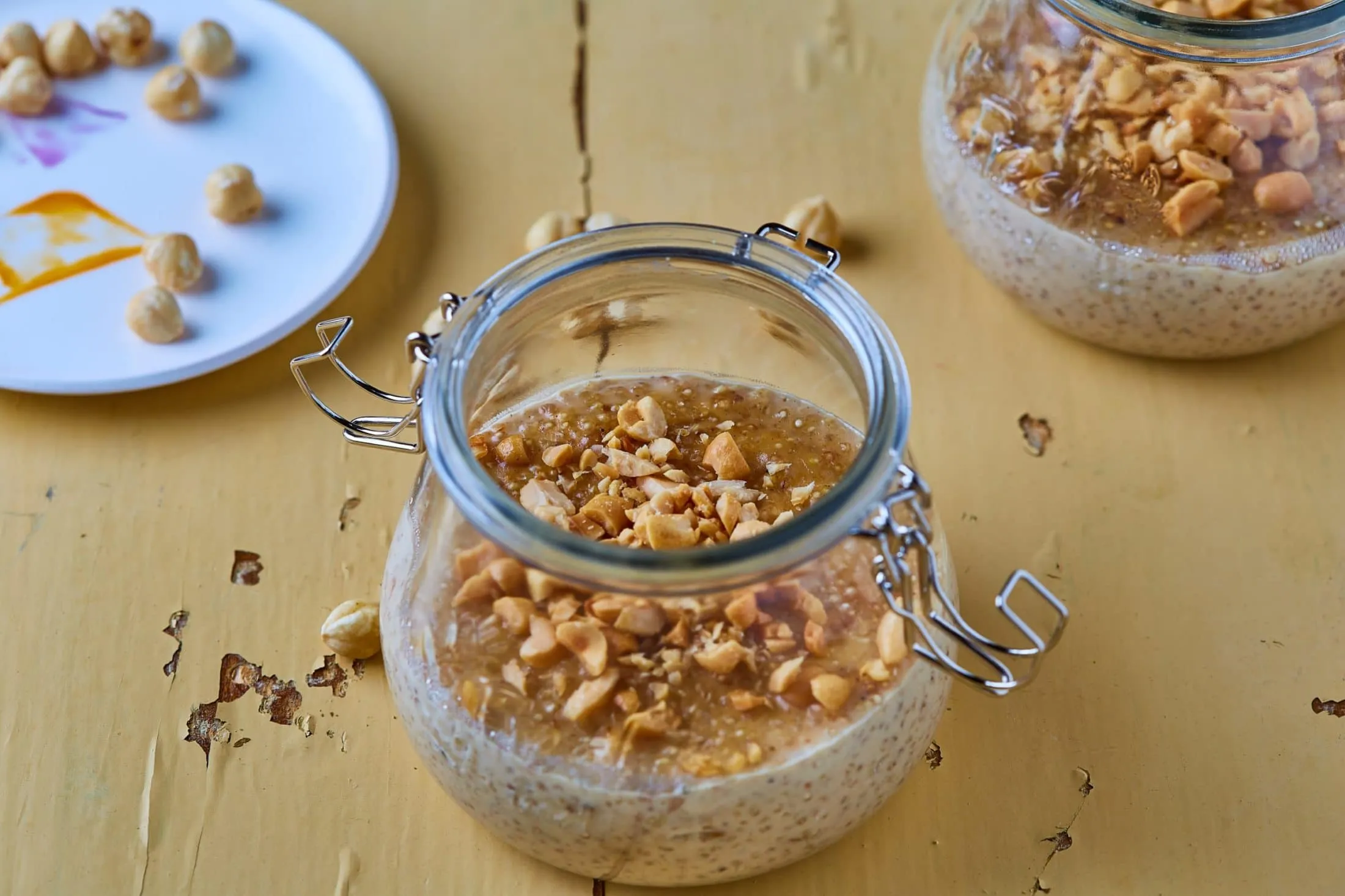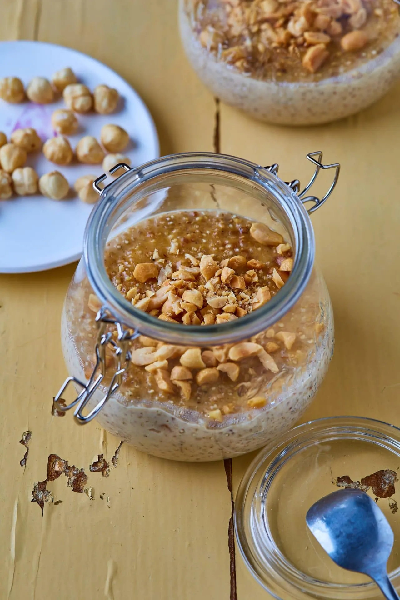 A quinoát egy lábasban kissé lepirítjuk, majd felöntjük a tejjel és a tejszínnel. Belerakjuk a mogyoróvajat, a vaníliás cukrot és 1 marék apróra vágott földimogyorót. Kevergetve addig főzzük a quinoát, amíg megpuhul és szépen magába szívja a mogyoróvajas folyadékot. Üvegekbe vagy poharakba töltjük a „pudingot”, megszórjuk apróra vágott mogyoróval, és így hagyjuk kihűlni.