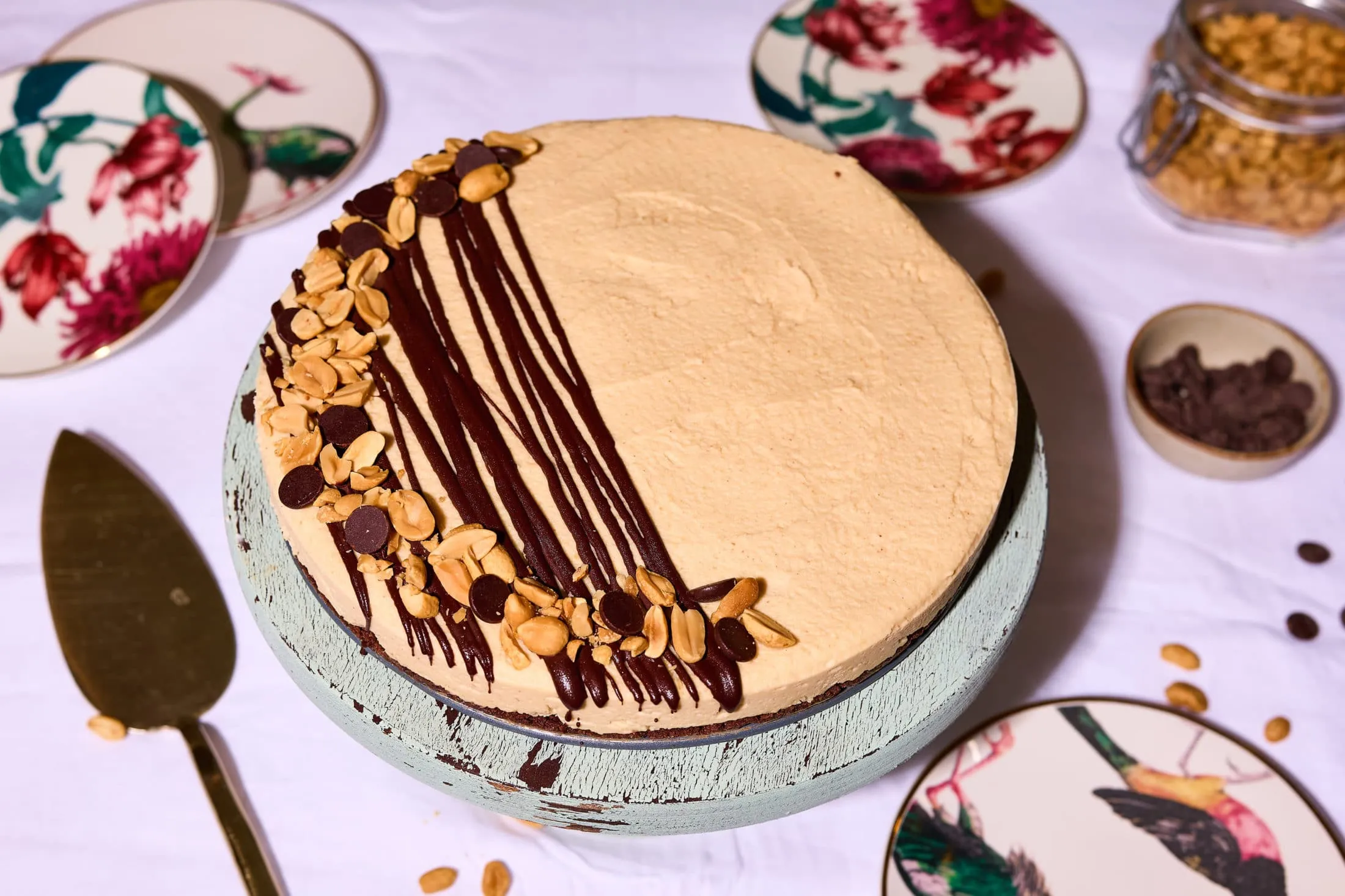 A mogyoróvajas sajttorta alapjához a darált kekszet összekeverjük a felolvasztott vajjal, és a sütőpapírral bélelt tortaforma aljába nyomkodjuk. Hűtőbe tesszük, míg elkészítjük a krémet.