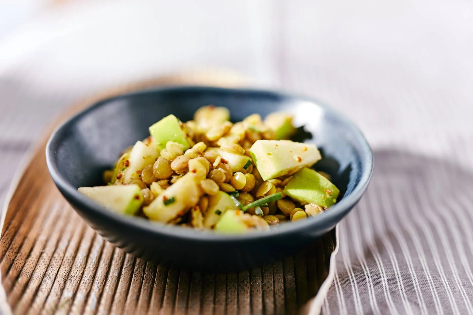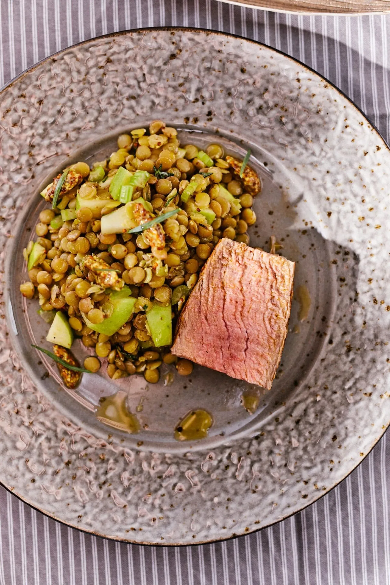 A lencsét megfőzzük, majd összekeverjük a kockákra vágott zellerszárral, almával és az aprított tárkonnyal. Sózzuk, borsozzuk, ráöntjük az olívaolajat és a fehérborecetet, és a hús mellé kínáljuk.