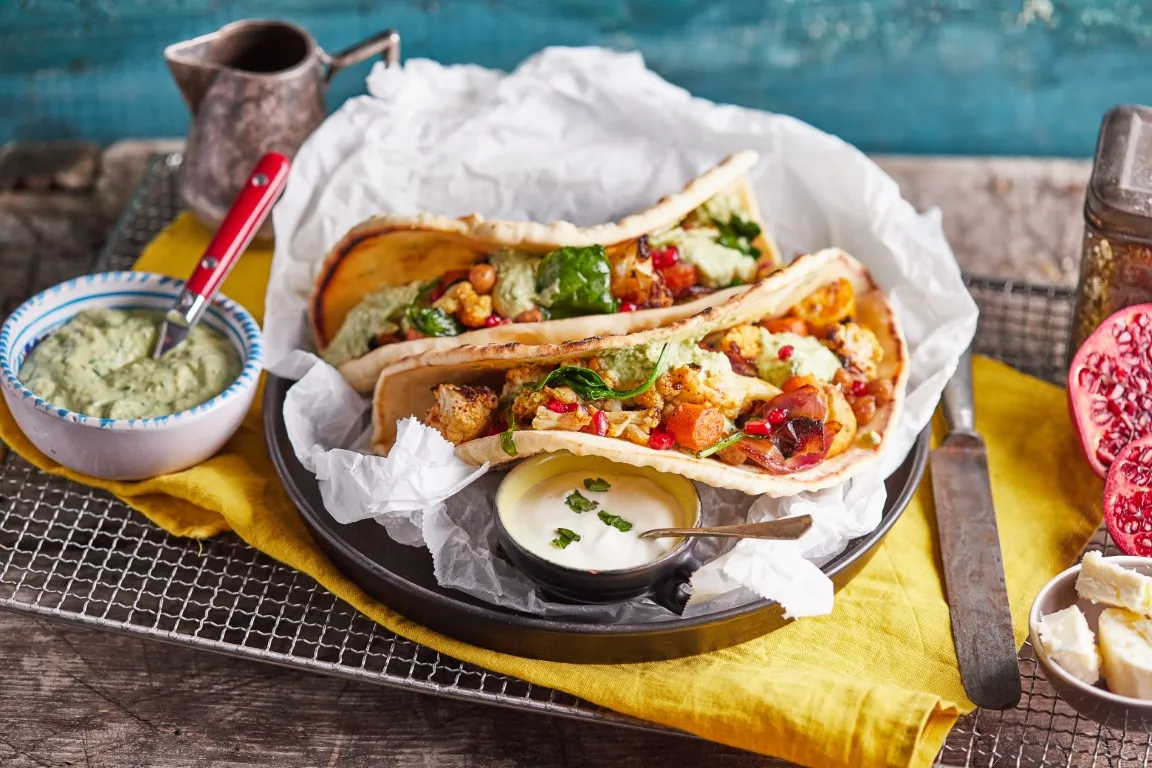 Egy serpenyőt felforrósítunk, kevés liszttel megszórjuk és beletesszük a kinyújtott tésztát, gyorsan lefedjük és addig sütjük, amíg fekete kis hólyagok nem keletkeznek a felületén, ekkor fordítunk rajta egyet és készre sütjük. Egy konyharuhába betakarva pihentetjük, hogy megpuhuljon a saját gőzében, amíg a többi naant megsütjük. A naan kenyereket meglocsoljuk kevés olívaolajjal, megpakoljuk a sült zöldségekkel és meglocsoljuk az avokádós szósszal, félbehajtjuk és tálaljuk.