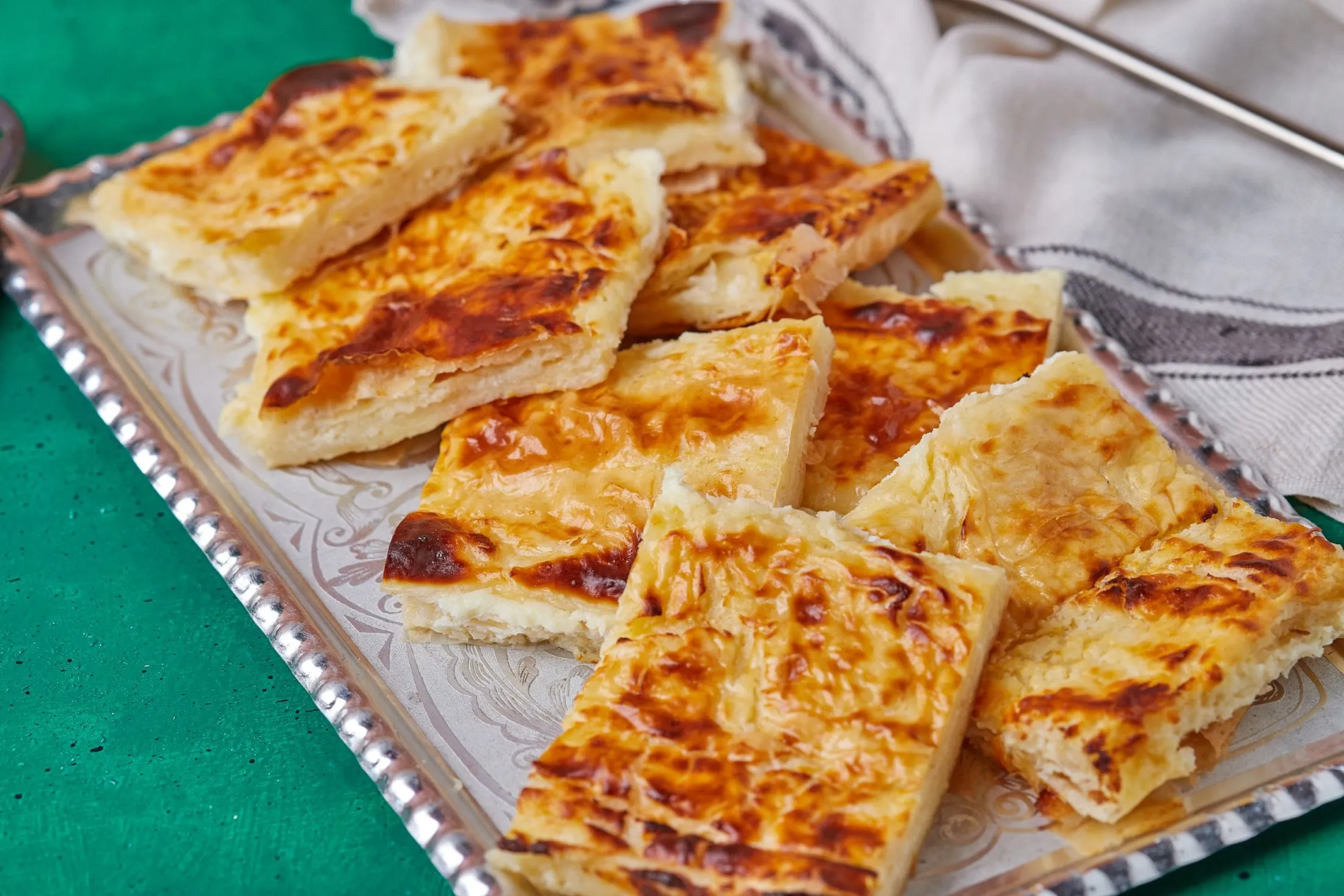 A réteslapot feltekerjük, és egy sütőpapírral borított tepsire tesszük. Ezt a többi réteslappal is megismételjük. Lekenjük a rudak tetejét tejföllel, és 200 fokra előmelegített sütőben kb. 30 perc alatt készre sütjük. Megvárjuk, míg kicsit kihűl, és felszeletelve tálaljuk.