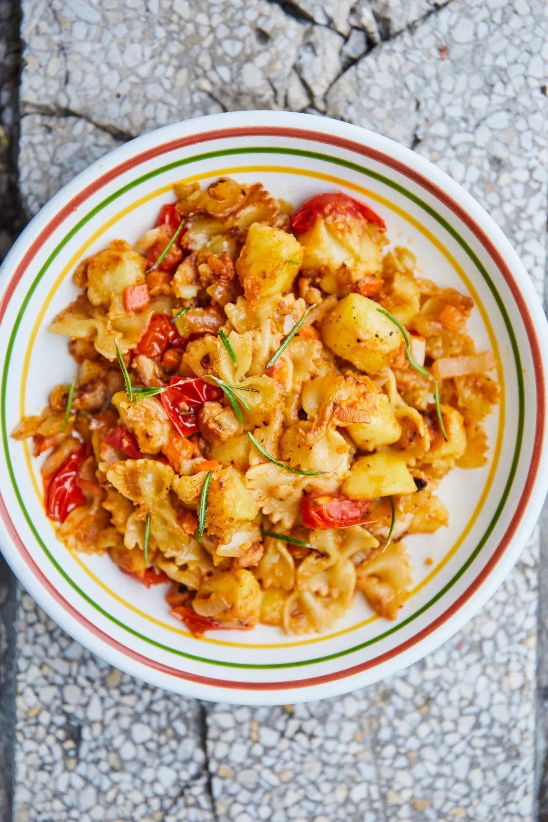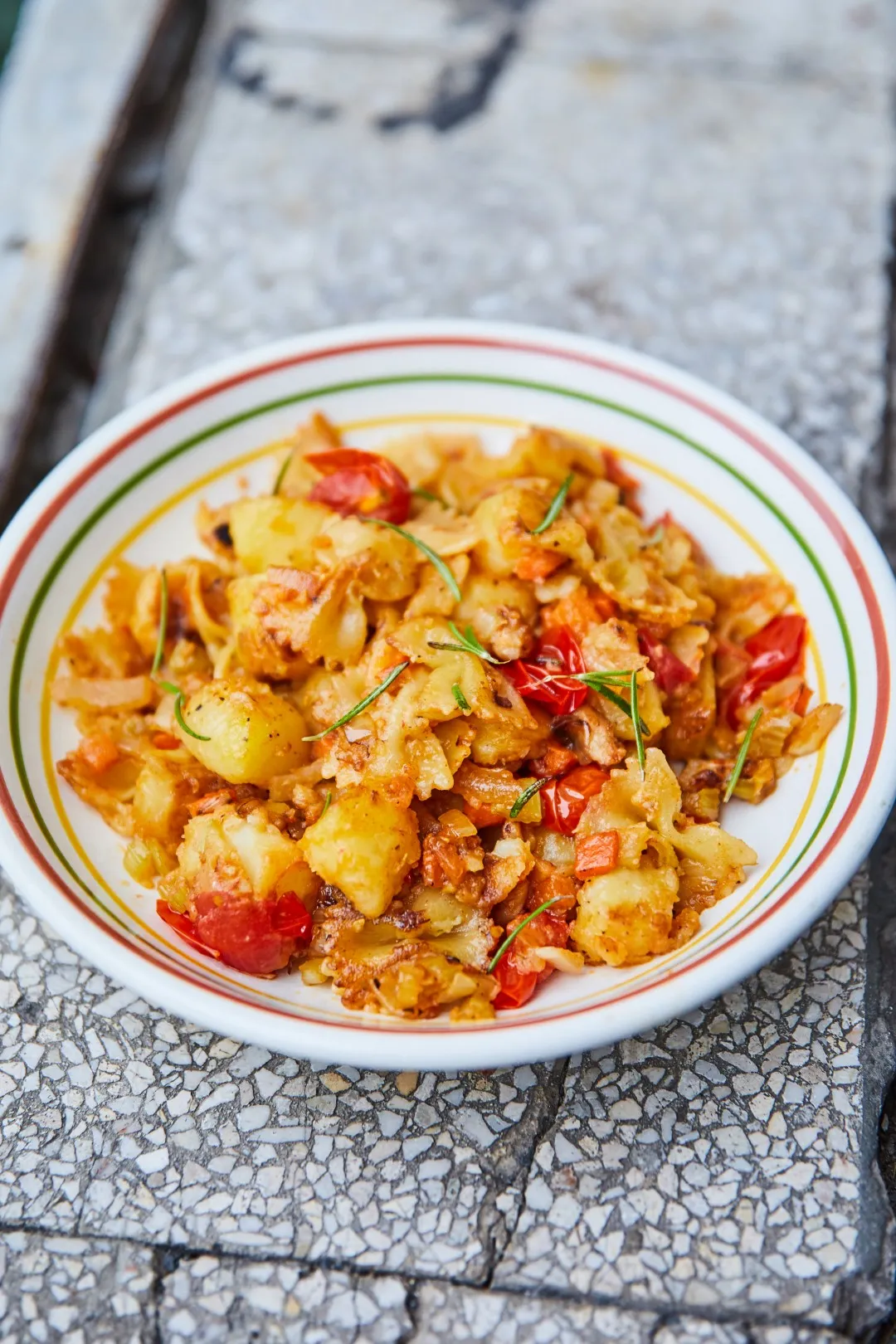 Sózzuk, borsozzuk, majd alaposan lepirítjuk az egészet, kiszedjük. Ugyanebben a serpenyőben 1 evőkanál olajon lepirítjuk az elfelezett koktélparadicsomokat, majd kiszedjük a hagymás alapra. Szintén a serpenyőben 3 evőkanál olajon aranybarnára pirítjuk a krumplit a tésztával együtt. Ezután visszarakjuk a hagymás alapot és a sült koktélparit. Az egészet jól összeforgatjuk, sózzuk, borsozzuk, belereszeljük a parmezánt és a sült rozmaringgal megszórva tálaljuk.