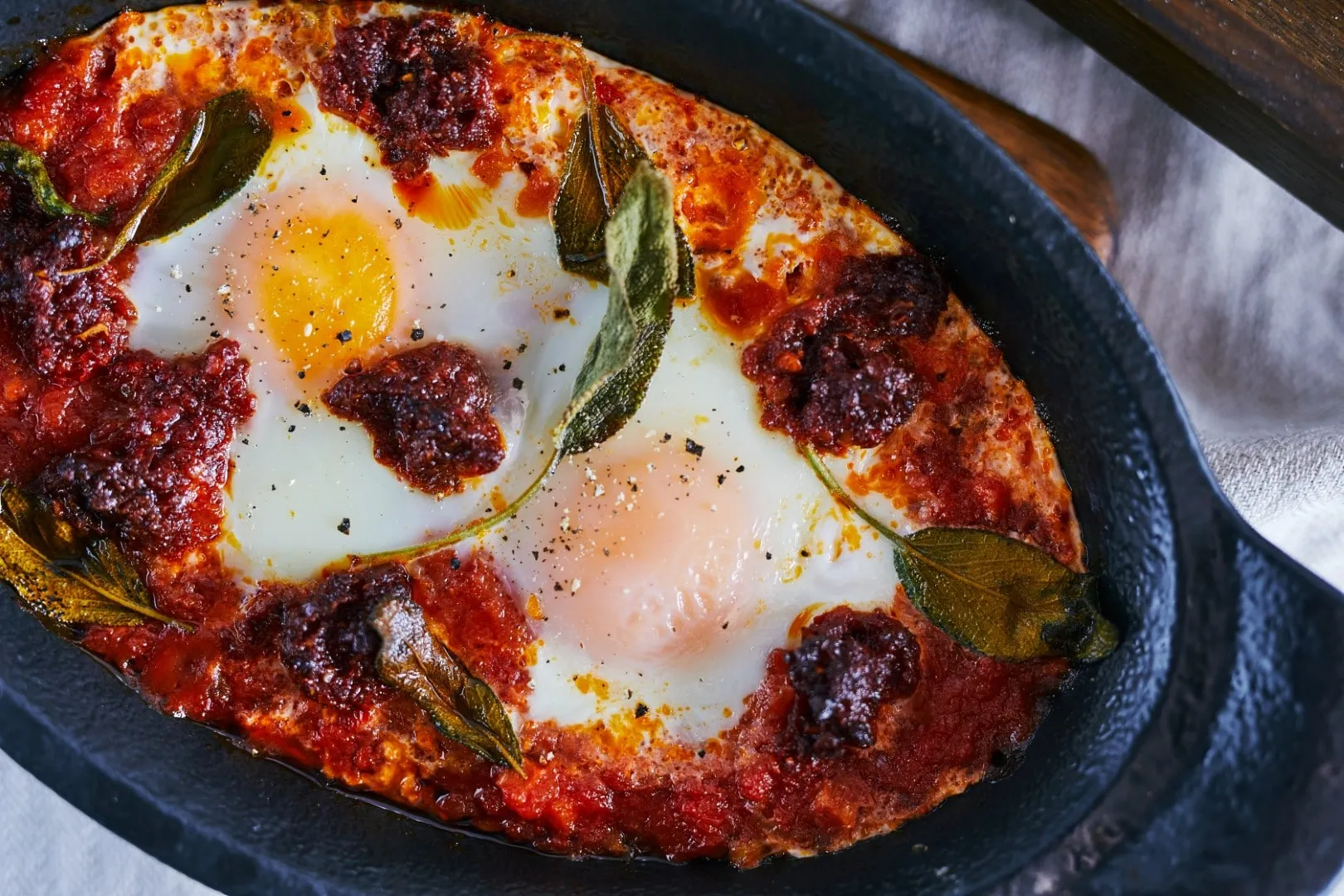 A paradicsomszószunkat kiszedjük egy kisebb, sütőbe helyezhető serpenyőbe, majd ráütjük a tojásokat, rátépkedjük a kolbászt és a zsályát, majd a 170 fokra előmelegített sütőben kb. 15 perc alatt készre sütjük. Fogyaszthatunk hozzá pirítóst, de magában is tökéletes.