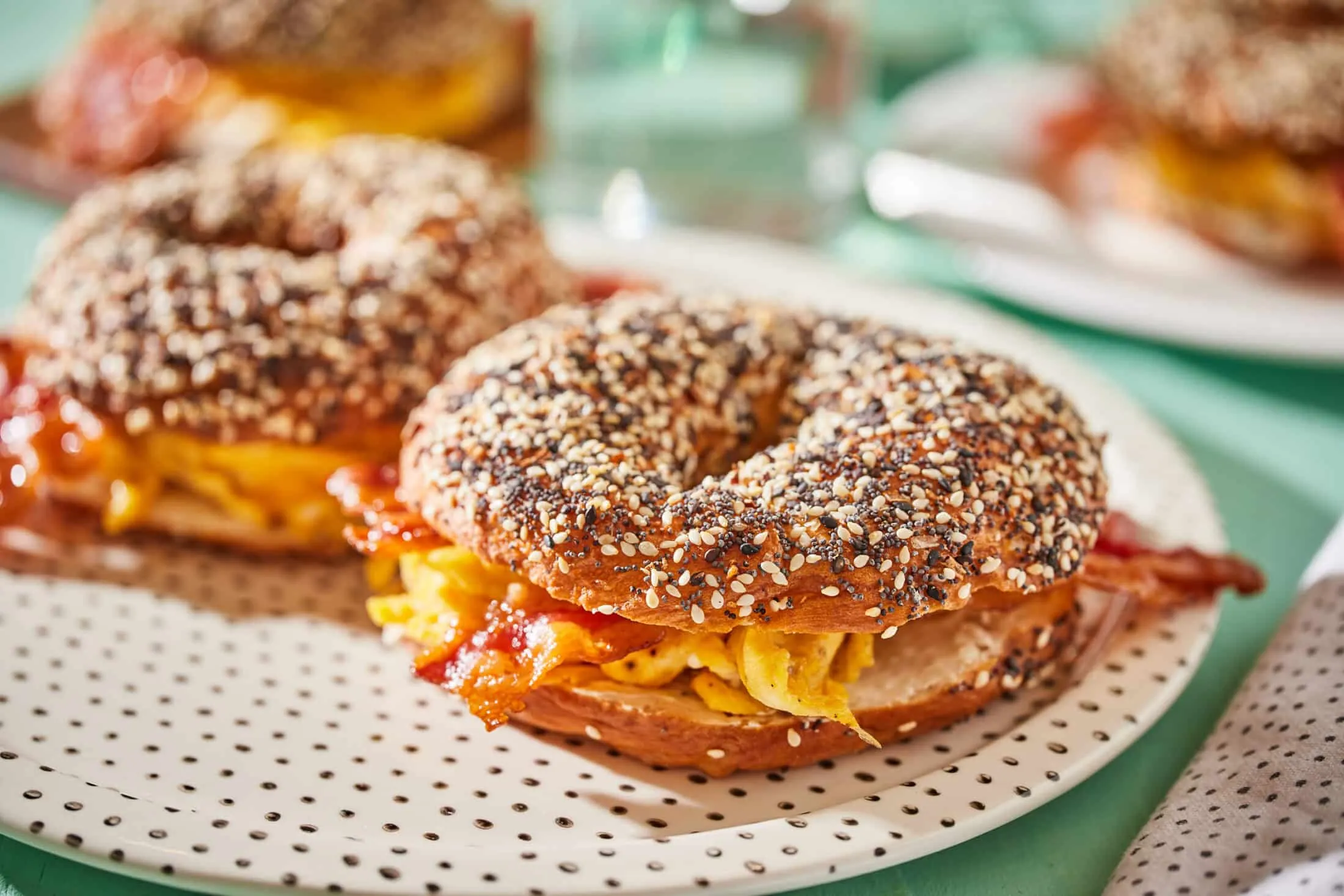 A bacont egy serpenyőben megpirítjuk, vagy két sütőpapír és tepsi közé rakjuk, és betesszük a sütőbe a bagelek alá, kb. 15 percre. A tojást felverjük a sóval, borssal, és a felmelegített vaj és olaj keverékén rántottát készítünk belőle. A megsült bageleket egy kicsit hagyjuk hűlni, elfelezzük, megkenjük a krémsajttal, erre jöhet a tojás és a bacon, és kész is.