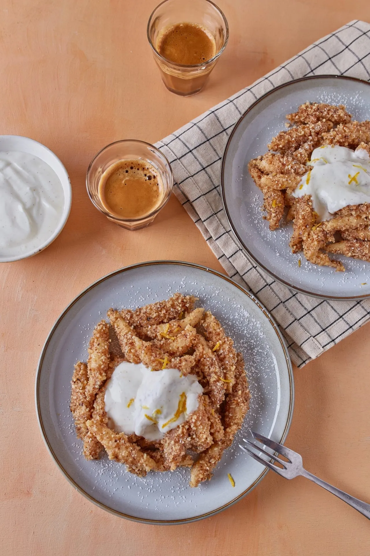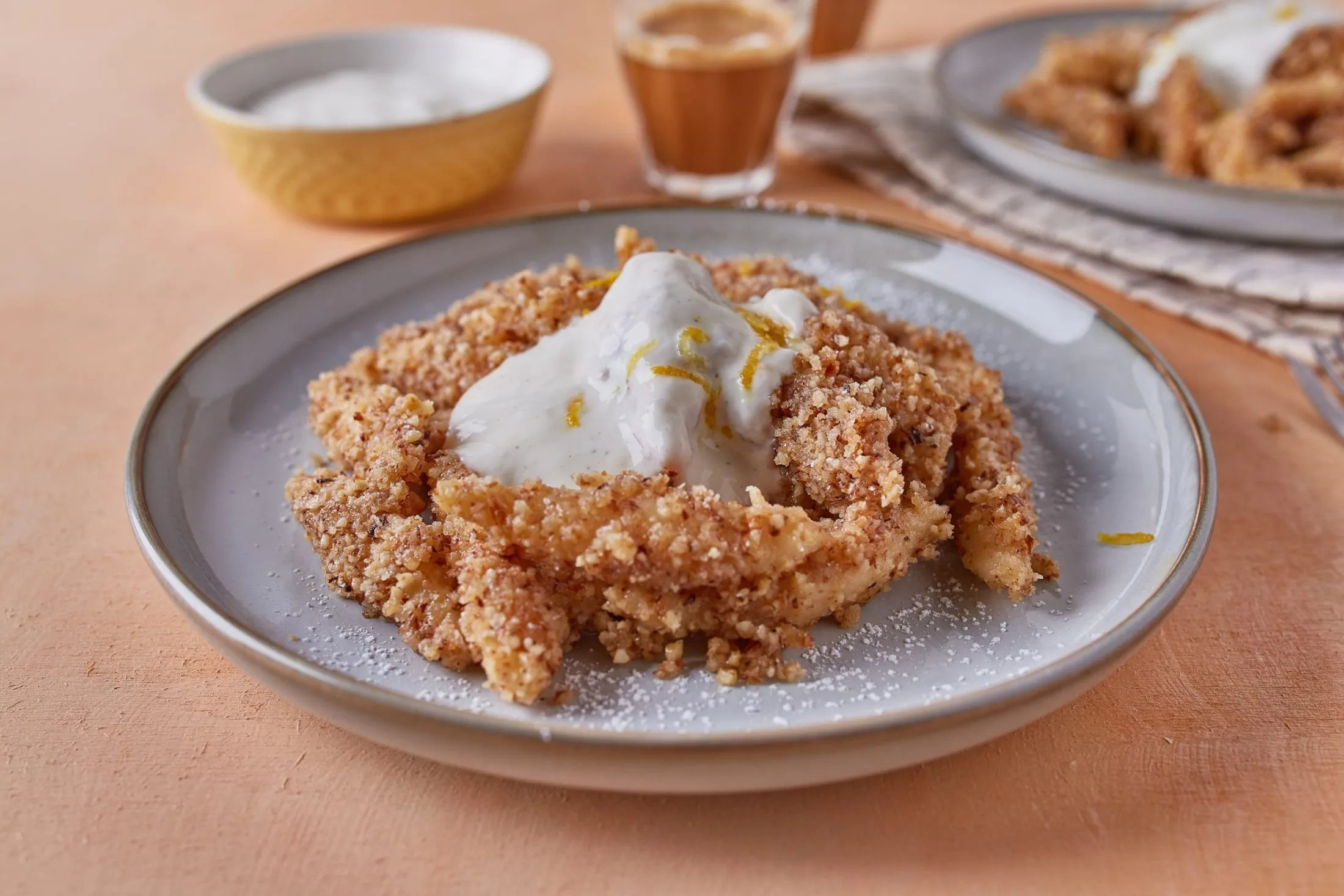 A morzsához lepirítjuk a diót, majd aprítóban lezúzzuk. A serpenyőben felolvasztjuk a vajat, beleszórjuk a porcukrot és a diót, párszor átforgatjuk, majd hagyjuk ezt is kihűlni. A citromos joghurthoz összekeverjük a görög joghurtot a porcukorral, a vaníliás cukorral, valamint a ½ citrom levével és reszelt héjával.