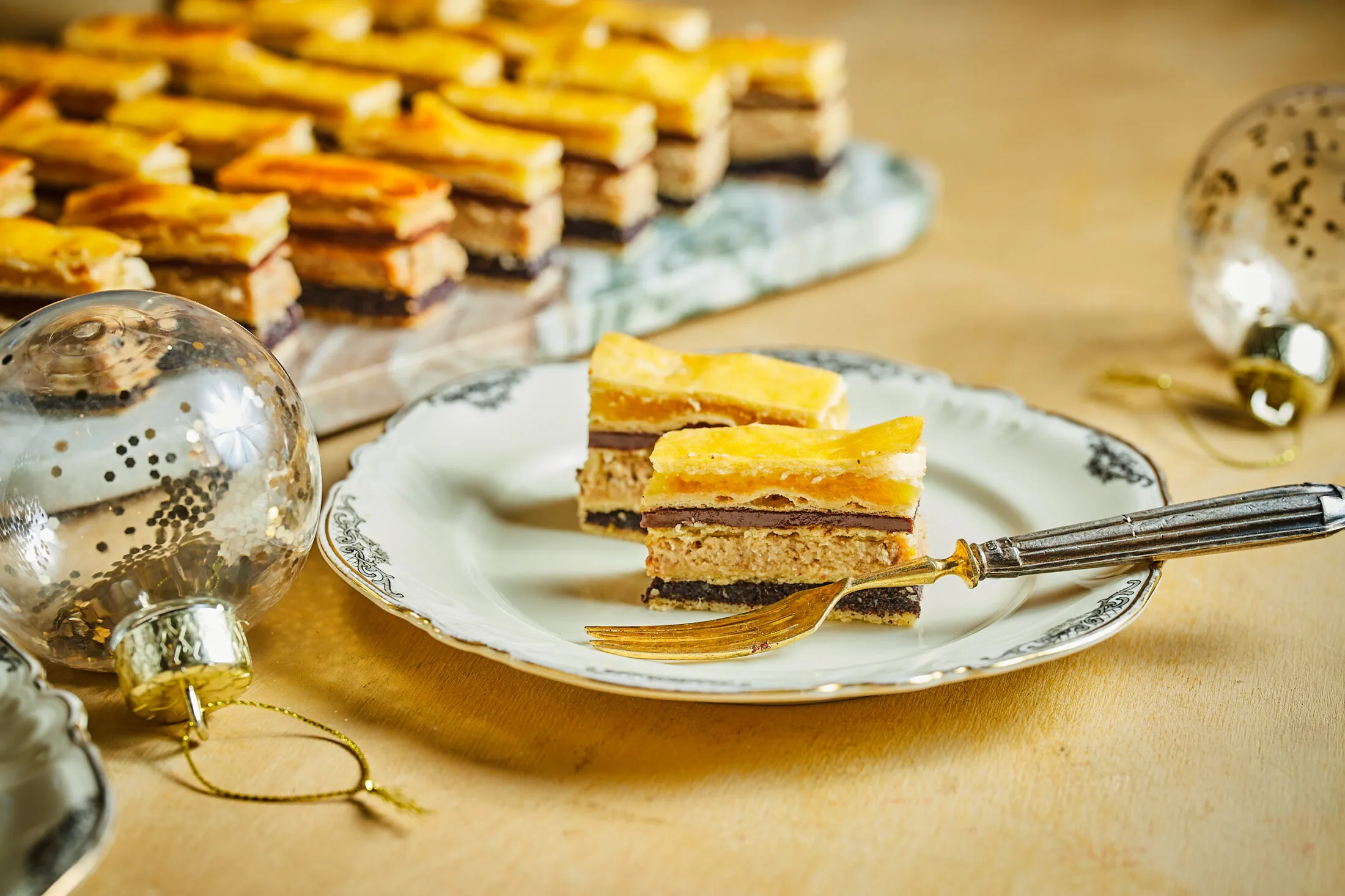 Mikor megvagyunk mindennel, jöhet az összeállítás. Alulra fektetünk egy megsült lapot, ezen egyenletesen elkenjük a máktölteléket, majd jöhet még egy lap, a diós töltelék, újabb lap, a NUTELLA® , egy újabb lap és az almaszószos réteg. Végül a tojással lekent lappal zárjuk a sort, és az egész sütit hűvös helyen pihentetjük egy éjszakát, hogy alaposan összeérjenek a rétegek.