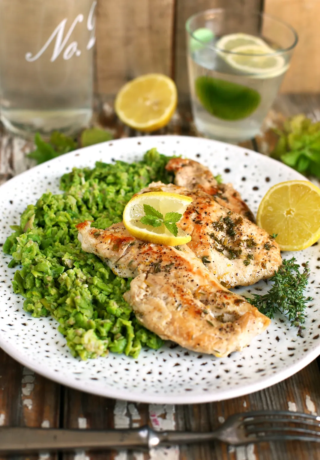 A zöldborsópüréhez egy kisebb lábasban olajat forrósítunk, beledobjuk az apróra vágott vöröshagymát, fokhagymát és kissé lepirítjuk. Sózzuk, borsozzuk, hozzáadjuk a zöldborsót, egy kevés vizet és lefedve 5-10 percig pároljuk. Hozzádobjuk a kakukkfüvet és villával alaposan áttörjük, végül a csirkemellel tálaljuk.