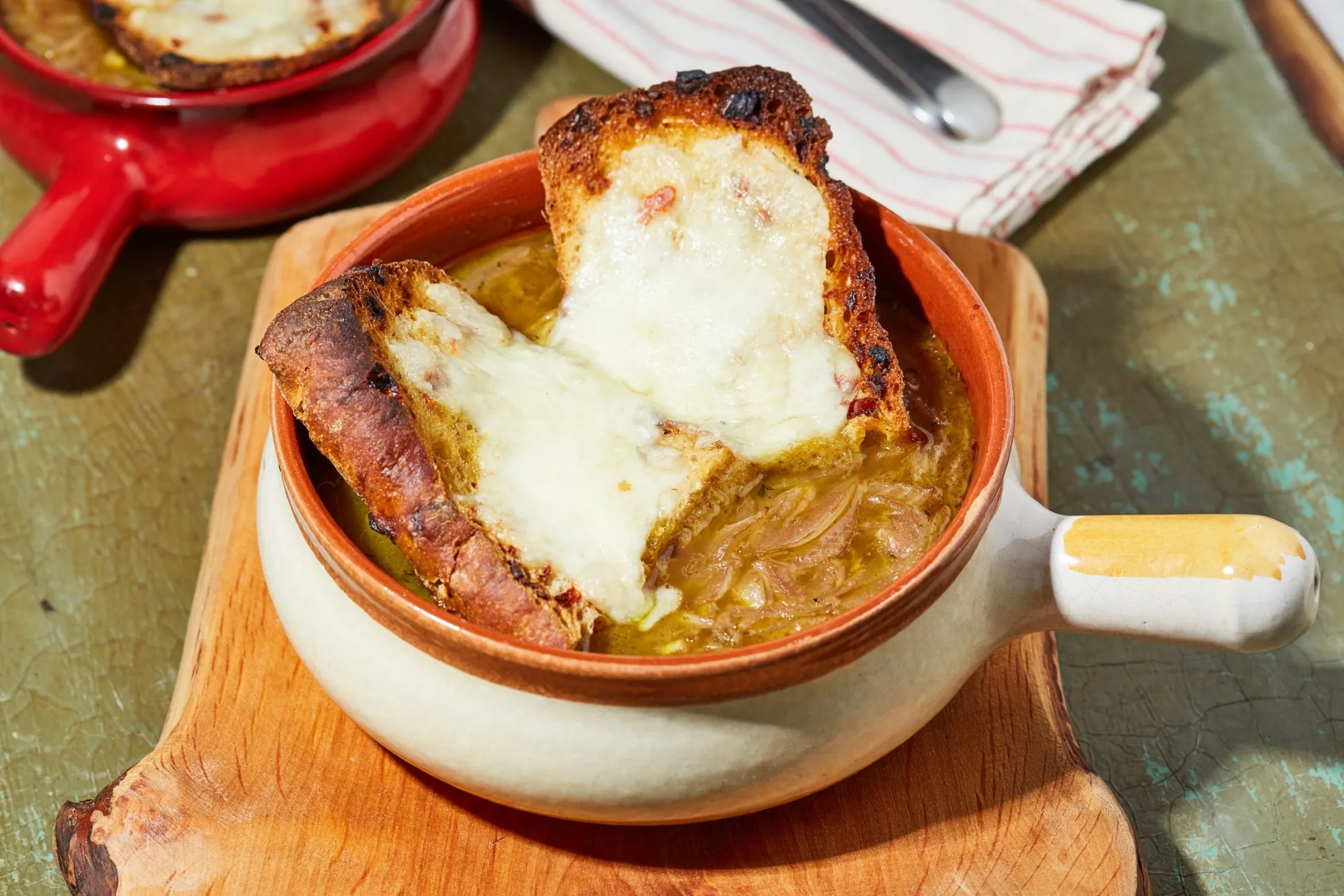 A hagymát félfőre vágjuk, lassan megkaramellizáljuk az olaj és vaj keverékén, sózzuk, borsozzuk. Rárakjuk a kakukkfüvet, a zúzott fokhagymát, hozzáöntjük a bort, majd ha elpárolgott, felöntjük az alaplével, és felforraljuk. Kis, hőálló tálakba szedjük, majd felszeleteljük a ciabattát, meglocsoljuk egy kevés olívaolajjal, rátépkedjük a mozzarellát, rárakjuk a levesre, és sütőben addig sütjük, amíg meg nem pirul a sajt.