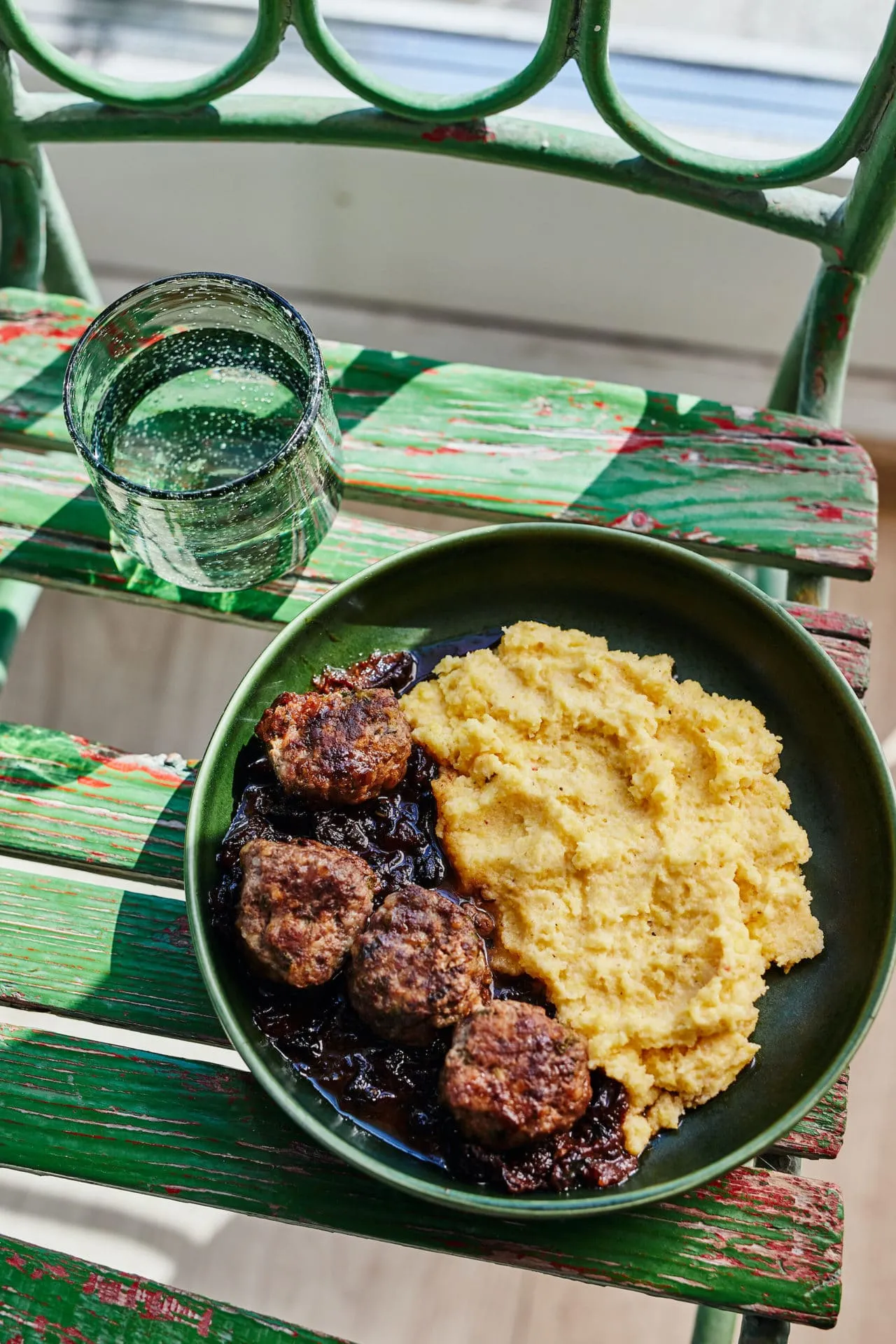 A polentához felforraljuk az alaplevet, beleöntjük a tejet, majd a kukoricadarát, addig főzzük, amíg be nem sűrűsödik az egész. A végén hozzáadjuk a vajat, a parmezánt, a szerecsendiót, és sózzuk, borsozzuk. A polentát a húsgolyóval és a mártással tálaljuk.