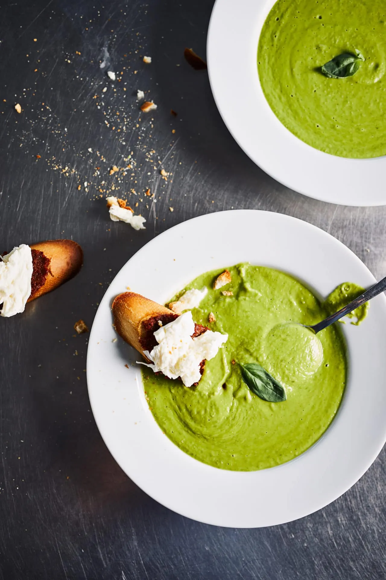 A leveshez a vaj és olívaolaj keveréken üvegesre pároljuk az apróra vágott hagymákat, sózzuk, borsozzuk. Belerakjuk a fagyasztott zöldborsót, és 5 percet pároljuk. Felöntjük az alplével, és puhára főzzük benne a borsót. Ezután egy aprítógépben pürésítjük a többi hozzávalóval együtt.