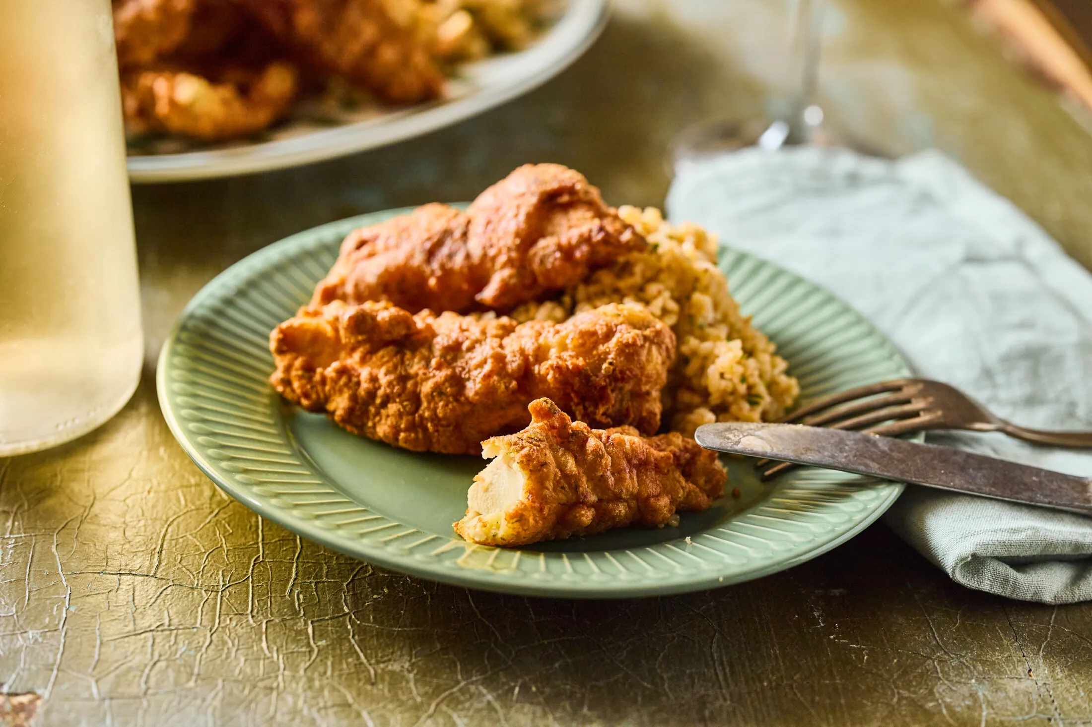A párolt rizst összekeverjük a pesztóval és a finomra vágott petrezselyemmel, és ezzel együtt tálaljuk a csirkecsíkokat.