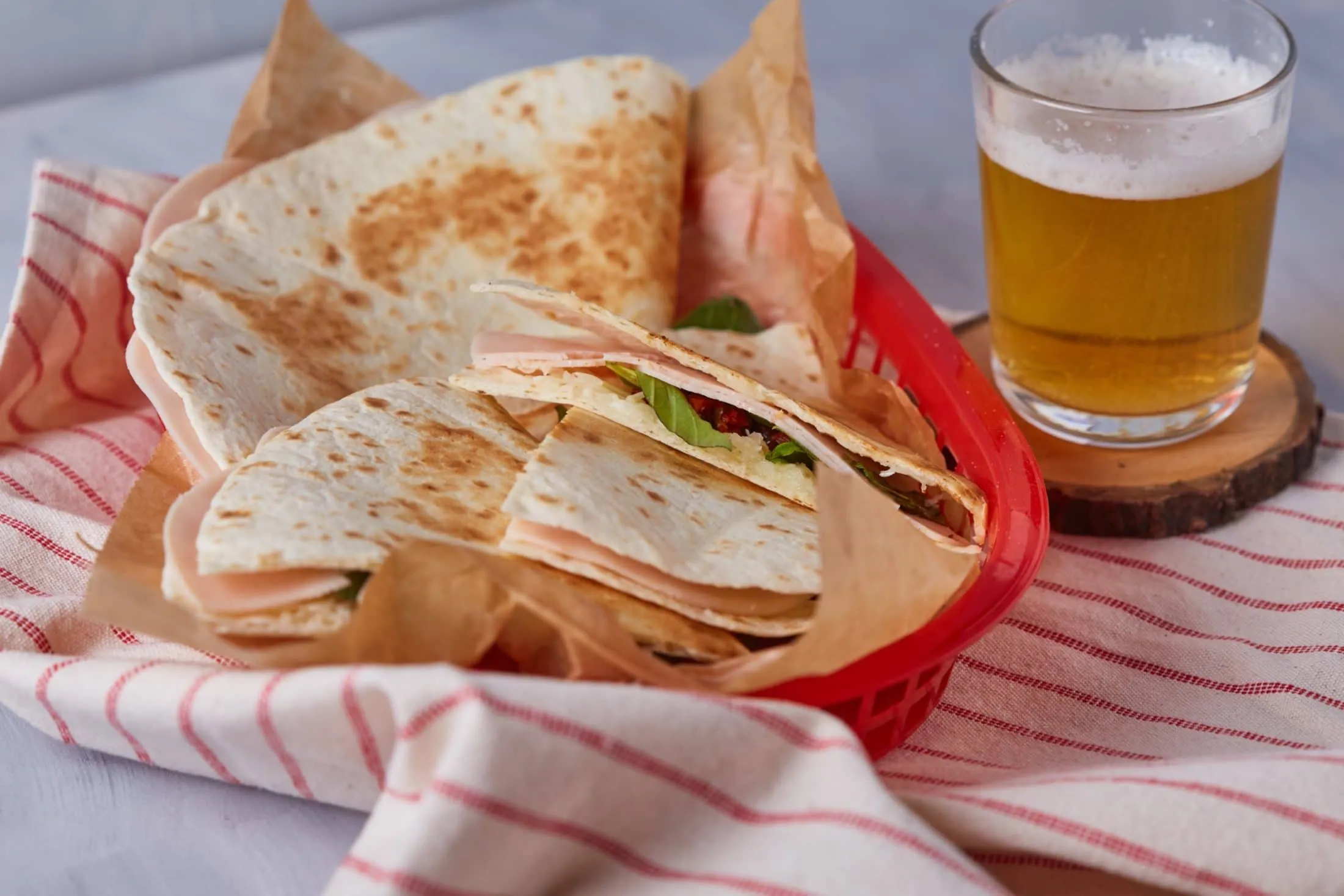 A sajtokat összekeverjük. Fogunk 2 tapadásmentes serpenyőt, nagyon forróra felmelegítjük, mindkettőbe beleteszünk 1-1 tortillalapot, képzeletben elfelezzük, és csak az egyik felét megszórjuk a sajttal, az aprított aszalt paradicsommal, beletesszük a csirkemellsonkát és jó sok friss bazsalikomot. Amikor megpirult a tortilla (kb. 3-5 perc), kicsúsztatjuk a serpenyőből, és gyorsan félbehajtjuk, majd ha akarjuk, felvágjuk, ha nem, akkor csak szimplán így harapjuk.
