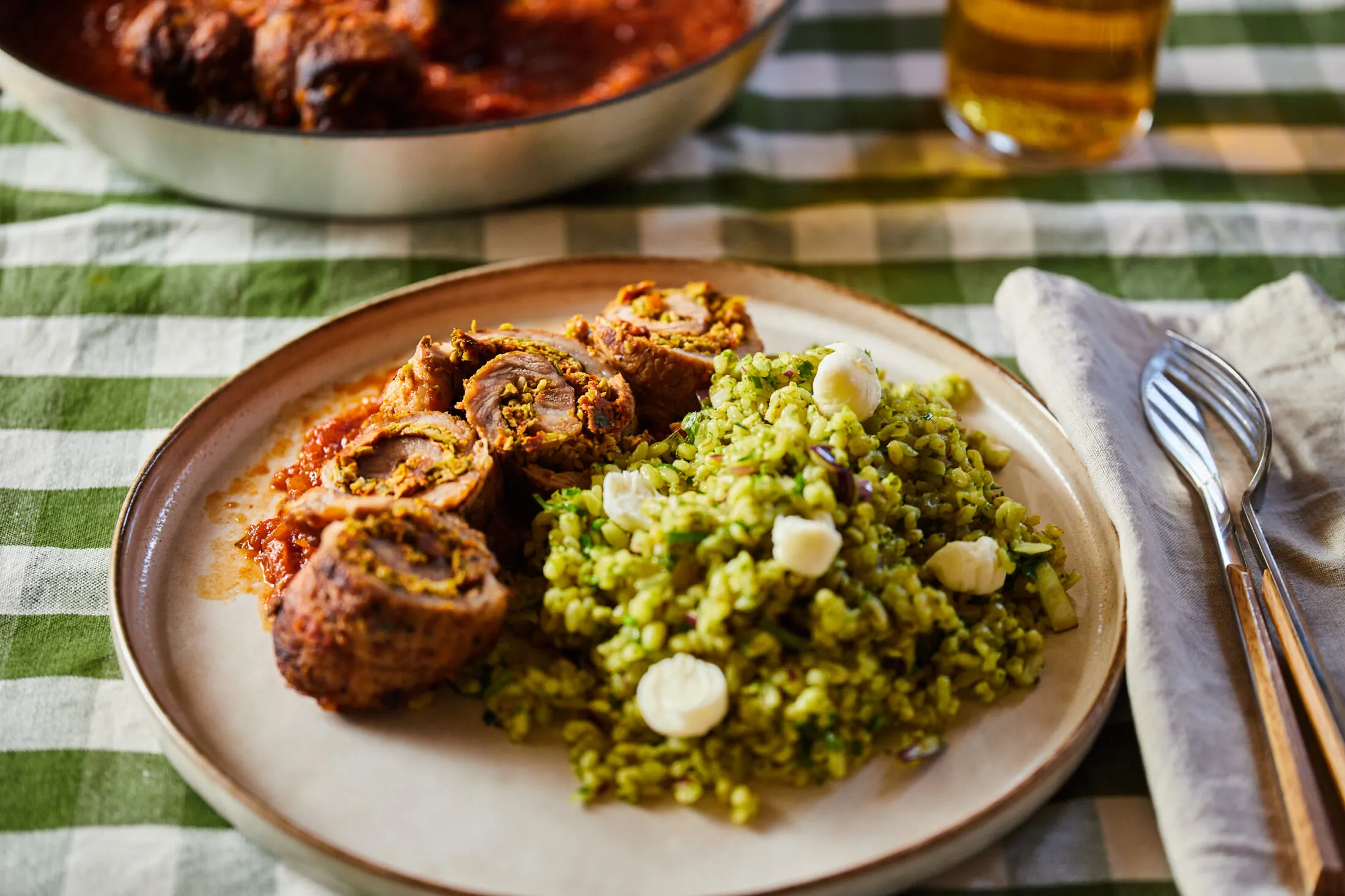 Tálaláshoz kanalazunk egy kis szószt a tányérra, erre jöhet pár szelet hús, mellé a bulgur, amire rádobálunk néhány mozzarellagolyót és a tetejét megszórjuk aprított snidlinggel. Buon appetito!