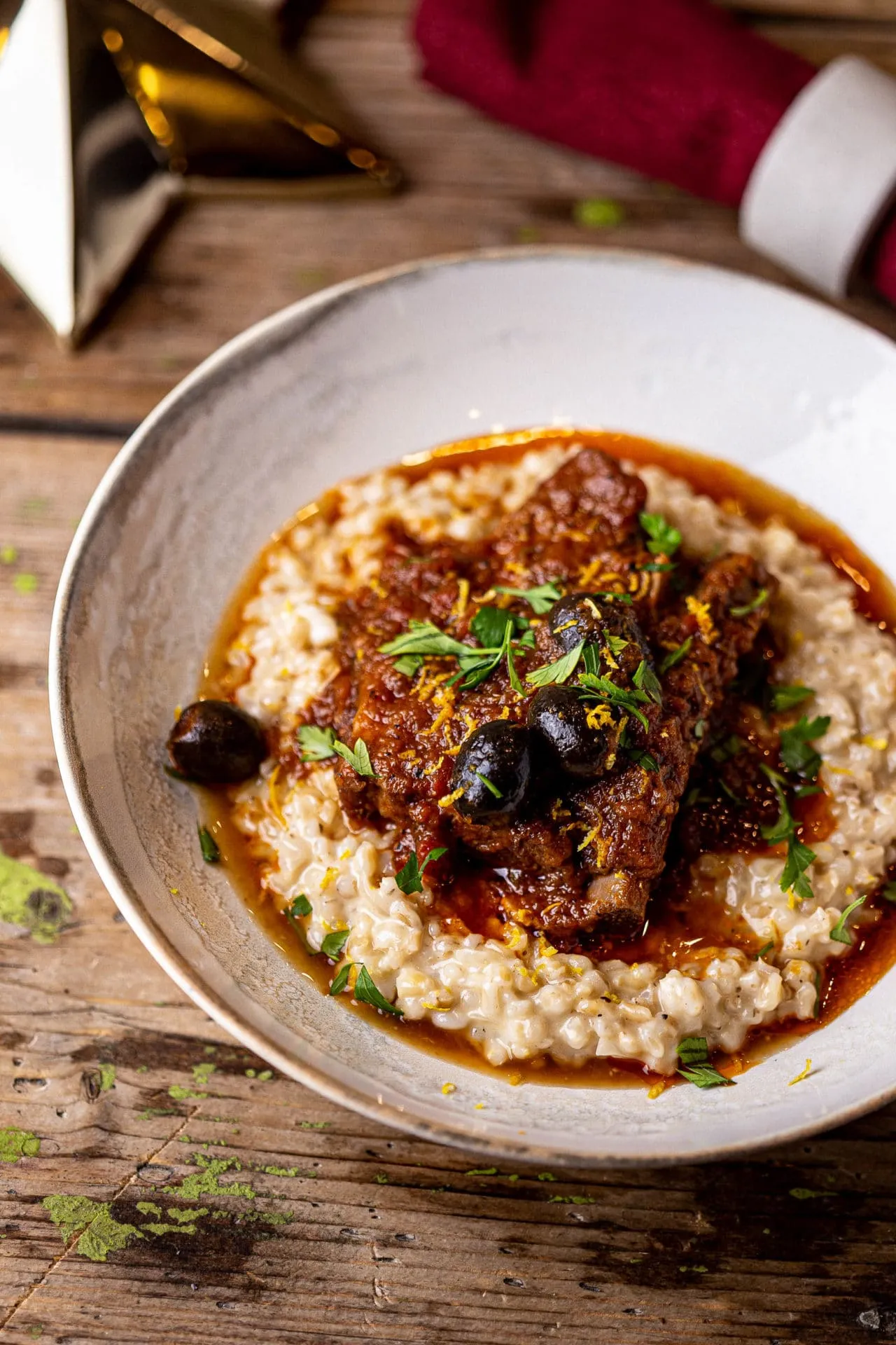 A körethez egy serpenyőben az olajon üvegesre pároljuk az apróra vágott hagymát. Rárakjuk a gerslit, majd felöntjük a fehérborral. Ezután fokozatosan, merőkanalanként adagoljuk hozzá az alaplevet, addig, amíg puha és krémes nem lesz az egész, közben sózzuk, borsozzuk. A legvégén belerakjuk a parmezánt és a vajat. A ragut ezzel a rizottóval tálaljuk, kevés frissen reszelt citromhéjjal és petrezselyemmel megszórva.