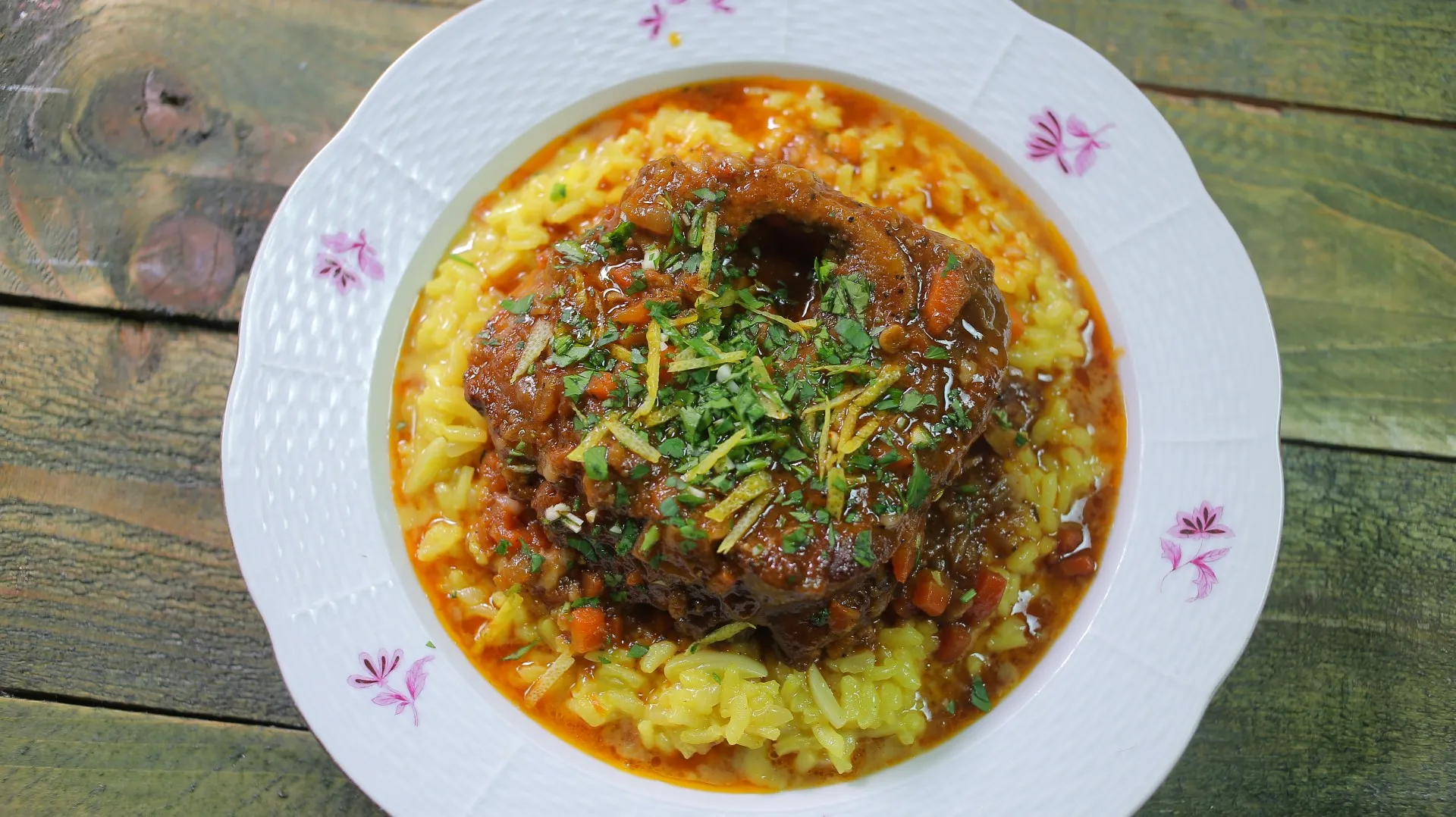 A tálalás a következőképpen néz ki: rizottó, rá egy adag mártás, majd egy borjúcsülök, ismét mártás, végül egy kevés gremolataval díszítjük.