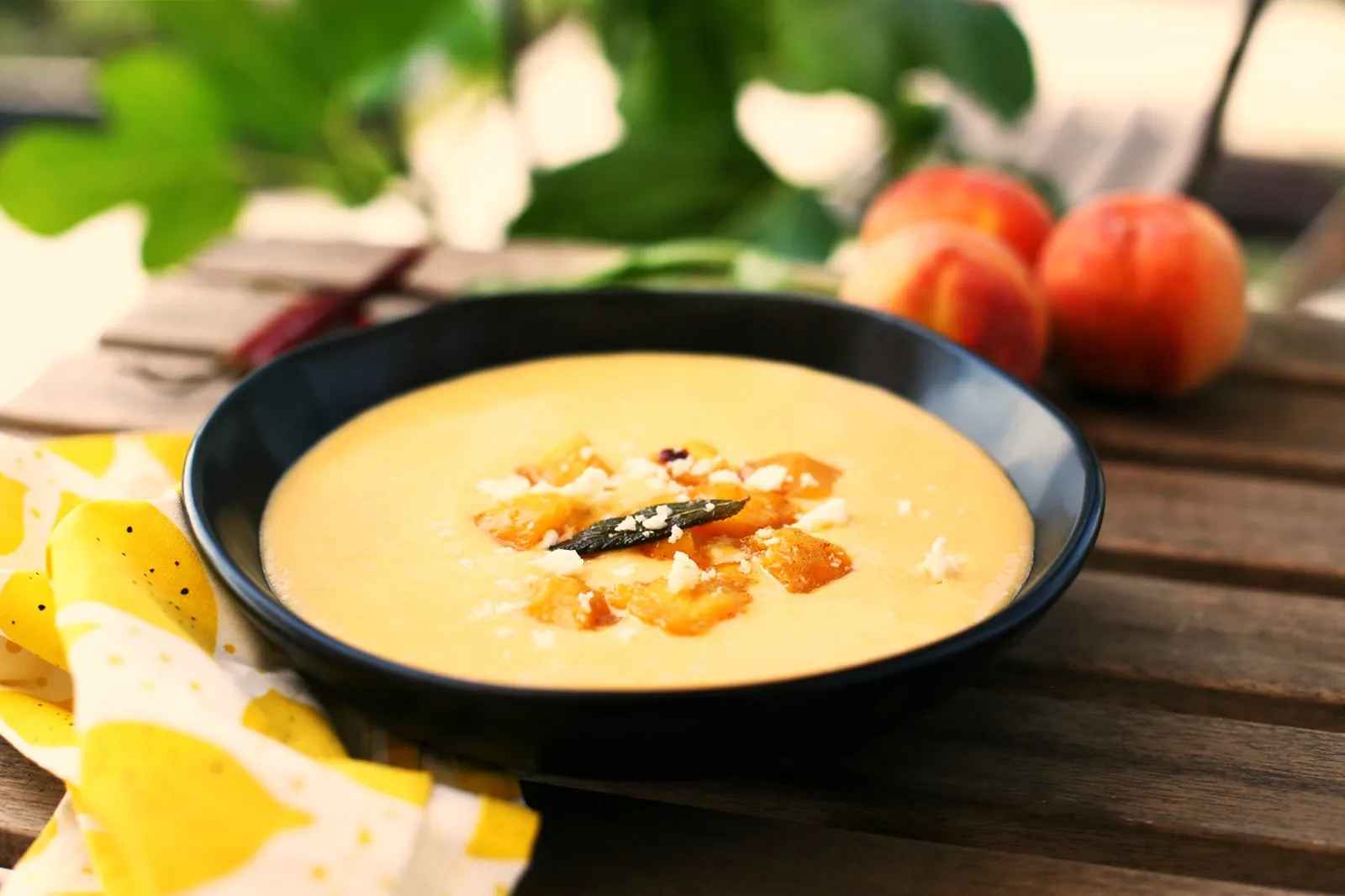A hideg levesre halmozzuk a zsályát, a chilit és a barackkockákat, végül pedig friss kecskesajtot morzsolunk az egészre.