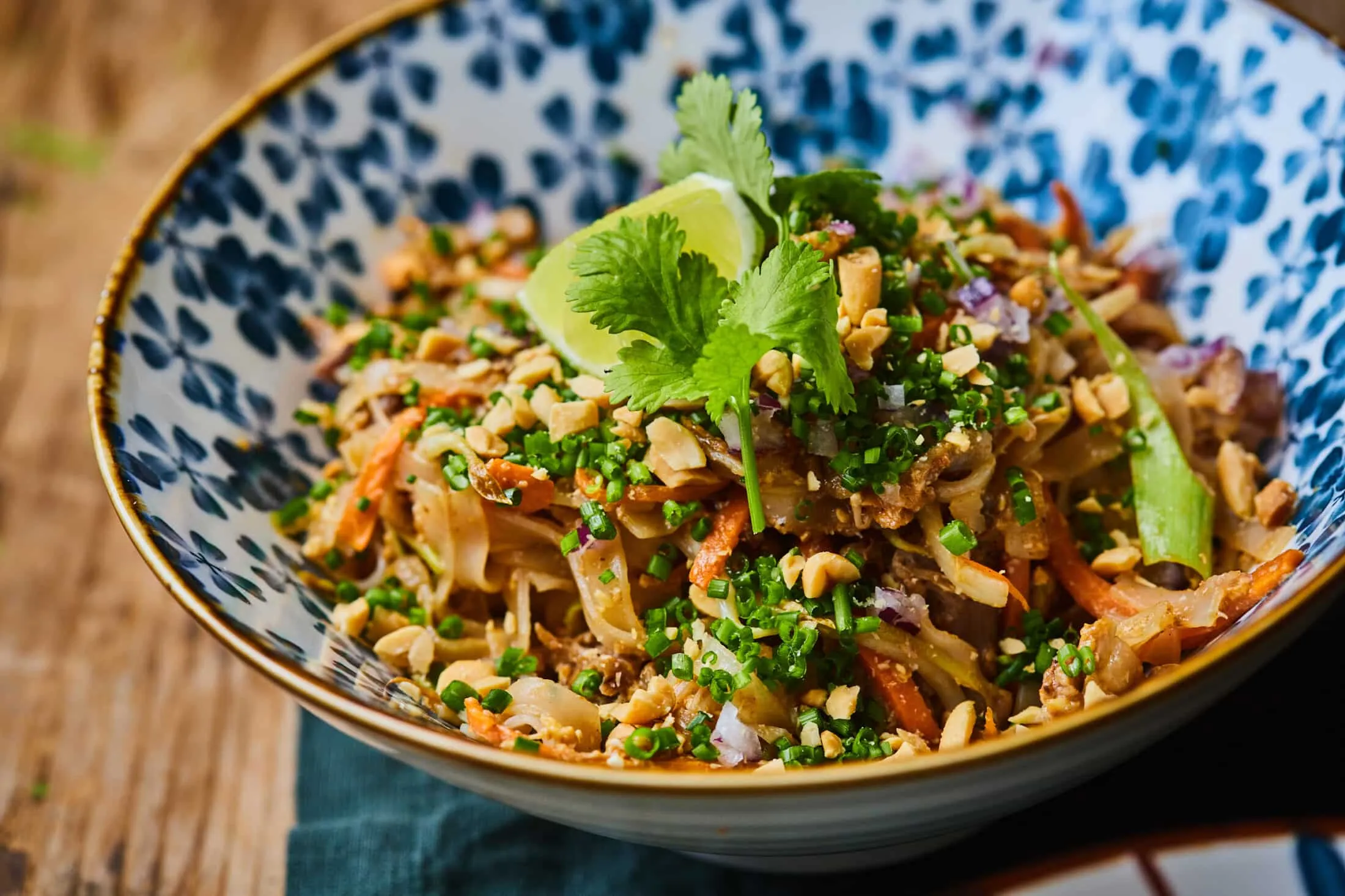 Ha elkészült az étel, tányérra szedjük, a tetejére finomra vágott snidlinget, lila hagymát és tört mogyorót szórunk. Egy gerezd lime-mal és korianderrel fejezzük be a tálalást.
