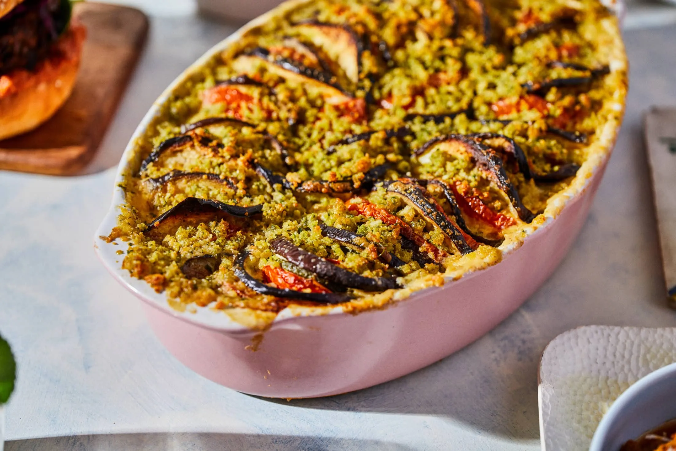 180 fokos sütőben kb. 40 percig sütjük. Míg sülnek a zöldségek, elkészítjük a krusztát. Egy késes aprítóba tesszük a szikkadt zsemlét, kicsit összezúzzuk, majd hozzáreszeljük a cheddart, beletesszük a petrezselymet is, és alaposan összezúzzuk. A végén hozzátesszük a vajat, és azzal is egy kicsit átzúzzuk. Kivesszük a sütőből a gratint, megszórjuk a tetejét a krusztával, és további 5-10 percre visszatesszük a sütőbe. Ha kicsit megpirult a kruszta is a tetején, kivesszük és már fogyaszthatjuk is.