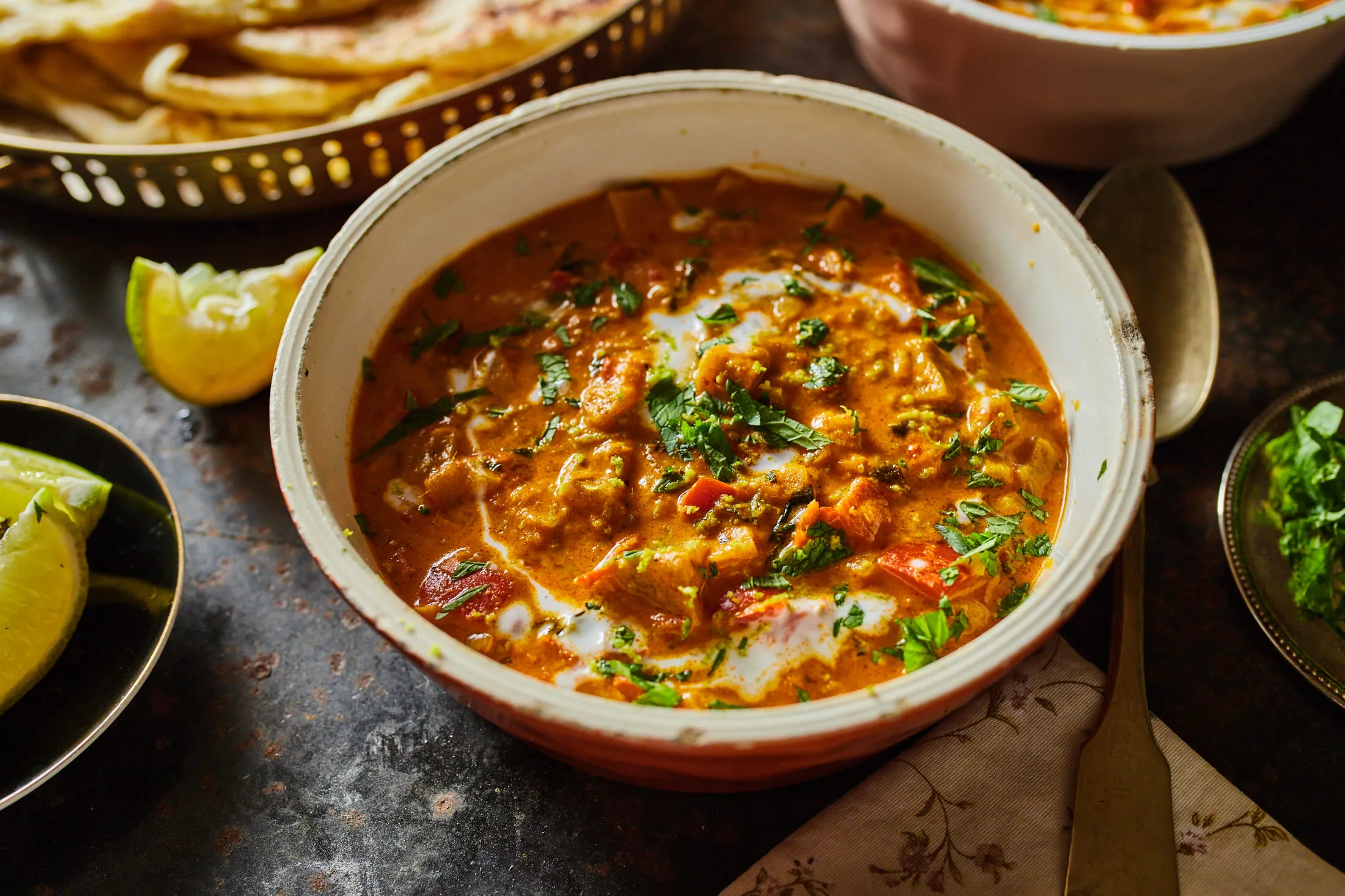 A padlizsános curry első lépéseként olajat forrósítunk egy mélyebb lábasban, és elkezdjük lepirítani a finomra vágott vörös- és fokhagymát. Rádobjuk az 1 cm-es darabokra felkockázott paradicsomot és kaliforniai paprikát, sózzuk, borsozzuk és belerakjuk a currypasztát is. Hagyjuk, hogy levet eresszen és 6-7 percig pirítjuk. Ezután felöntjük az alaplével, beledobjuk a megpucolt és szintén 1 cm-es darabokra felkockázott padlizsánt, fűszerezzük a köménnyel és a curryporral, és fedő nélkül közepes lángon 50 percig főzzük.