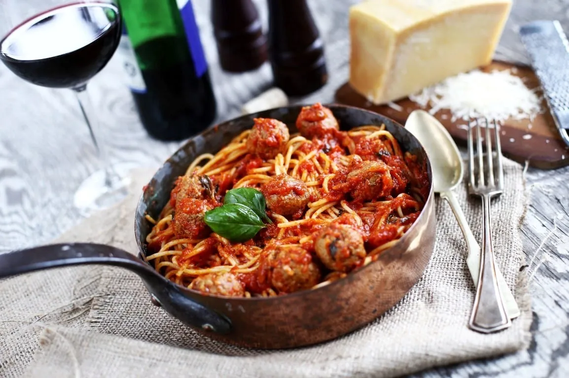 A paradicsomszószhoz olívaolajon megpirítjuk a finomra vágott vöröshagymát, fokhagymát, hozzáöntjük a passzírozott paradicsomot, fűszerezzük a szárított fűszerekkel, sóval, belevágjuk a bazslikom szárát és hozzáadjuk a cukrot. A szószt felforraljuk, pár percig hagyjuk magasabb lángon, majd ha összeforrt hozzáadjuk a vágott bazsalikomleveleket.A darálthúsos masszából diónyi méretű gombócokat formázunk és 180 C-ra előmelegített sütőben kb. 15-20 perc alatt megsütjük őket. A megsült húsgombócokat óvatosan összekeverjük a paradicsomszósszal. Spagettin vagy penne tésztán tálaljuk.