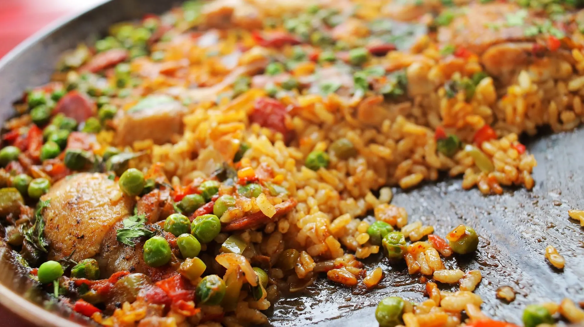 A paella csirkecombokkal is mennyei. Először a finoman sózott, borsozott csirkerészeket kevés olívaolajon közepes lángon 80% készültségűre pirítjuk, majd félretoljuk a serpenyő szélére és mellette a nagyon finomra vágott lila hagymát üvegesre pároljuk. Hozzádobjuk az apró kockára vágott kaliforniai paprikát, a szeletekre vágott fokhagymát és a vékony szeletekre vágott kolbászt is. Egy perc után hozzáöntjük a paradicsompürét, és sóval, borssal, a füstölt paprikával és a kakukkfű leveleivel ízesítjük.