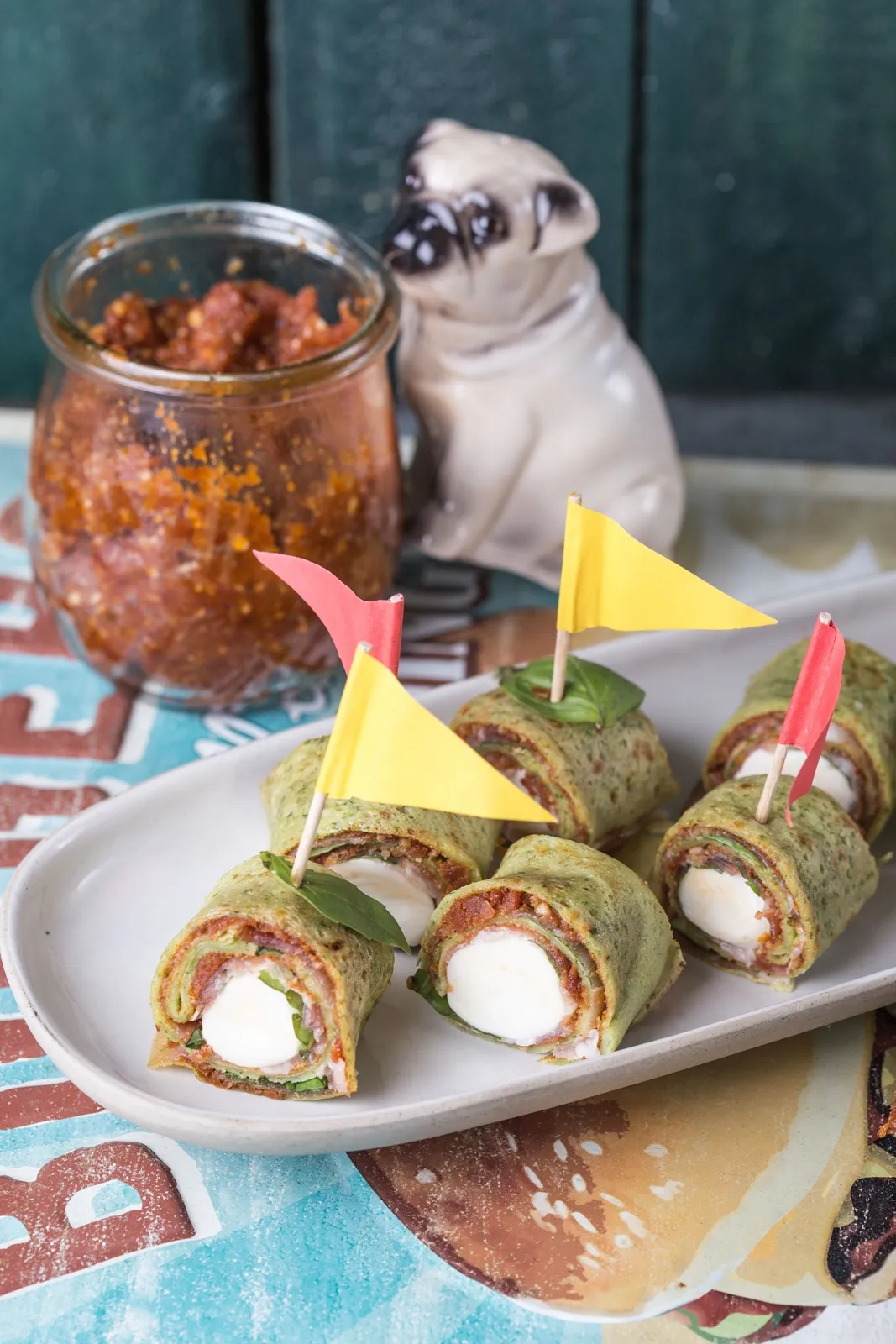 A palacsintához a spenótleveleket kb. 1 percre forró vízbe dobjuk, lecsepegtetjük és egy aprítógépbe (vagy turmixgépbe) rakjuk. Hozzáadjuk a tojást, 1 kanál lisztet és alaposan lezúzzuk. Hozzáadjuk a többi hozzávalót és átzúzzuk az egészet, hogy homogén palacsintatésztát kapjunk. Teflonserpenyőben kisütjük a palacsintákat. A vörös pesztóhoz szintén egy aprítóba rakjuk a hozzávalókat és lezúzzuk. A palacsintákat megkenjük a pesztóval, rakunk rá pár szelet serrano sonkát, egy sorban mozzeralla golyókat, feltekerjük a palacsintákat, hüvelykujjnyi szeletekre vágjuk és kész is vagyunk vele.