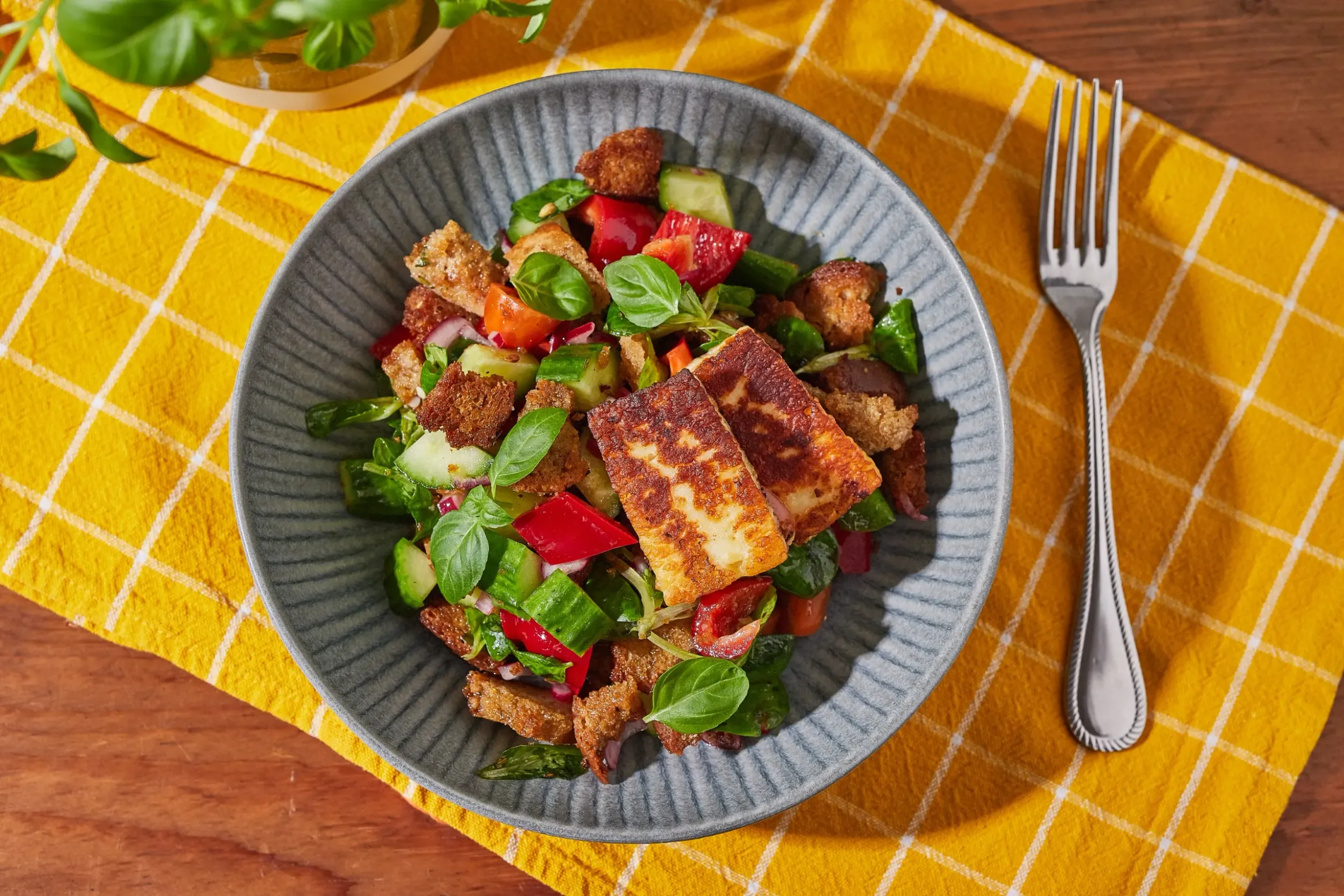 Végül összeállítjuk a salátát: a zöldségekhez adjuk a lila hagymát, a visszamaradt ecetet kikeverjük a dresszing többi hozzávalójával, és ezt is a salira öntjük. Rászórjuk a krutont, az egészet összekeverjük, megszórjuk friss bazsalikommal, és a sajttal tálaljuk.